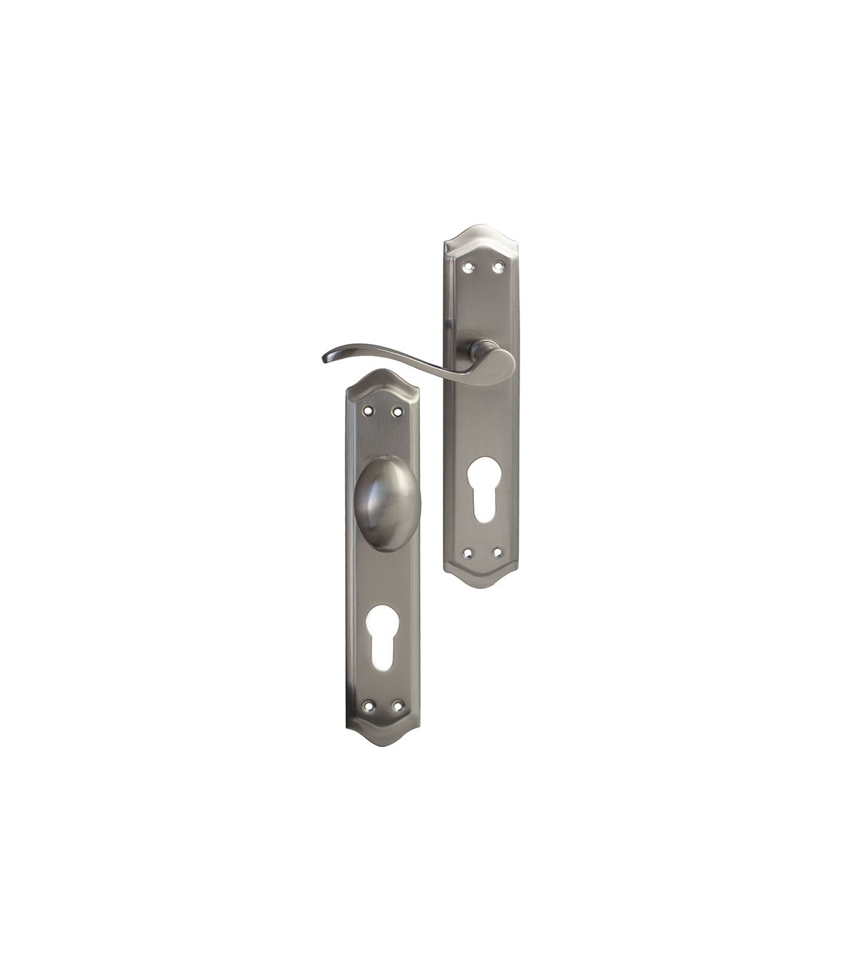 Juego y placa pomo con bocallave 85 mm. Aluminio acabado níquel satinado. Placa 49xh.256 mm.