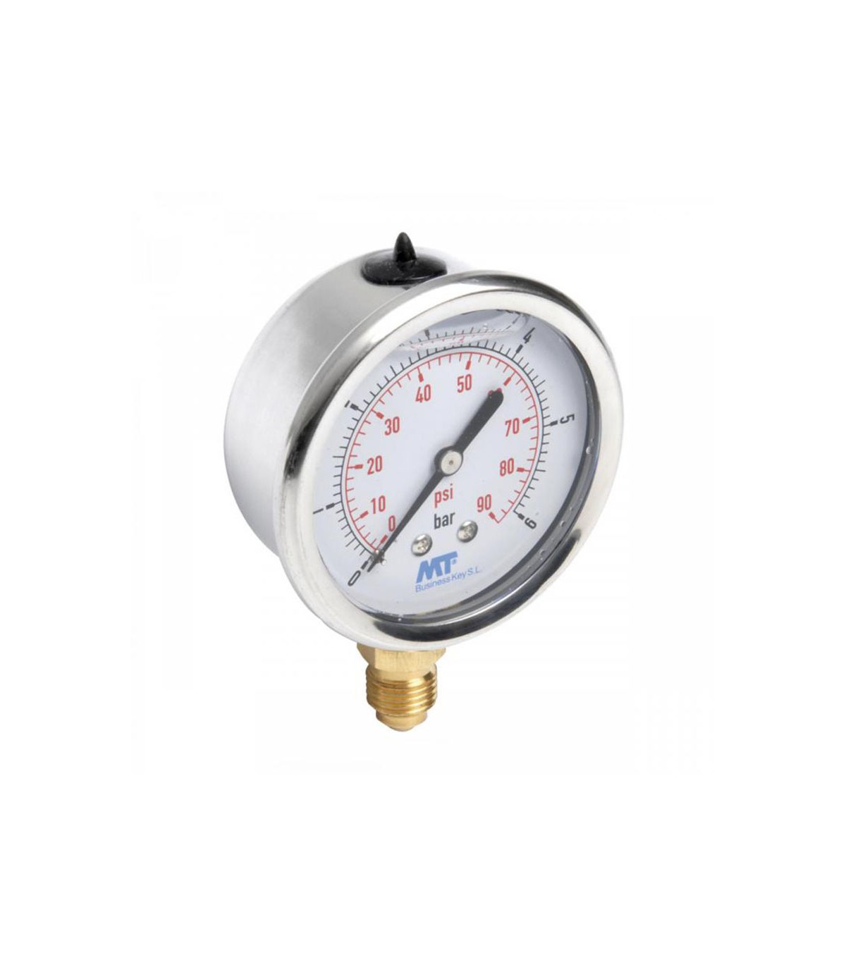 Manómetro inox ø 63 mm con conexión inferior. Caja y anillo de cierre acero inox A-304. Relleno de glicerina que prolonga la vida del manómetro y previene la condensación, minimiza el desgaste mecánico y realiza la amortiguación contra elevadas cargas dinámica y vibraciones.