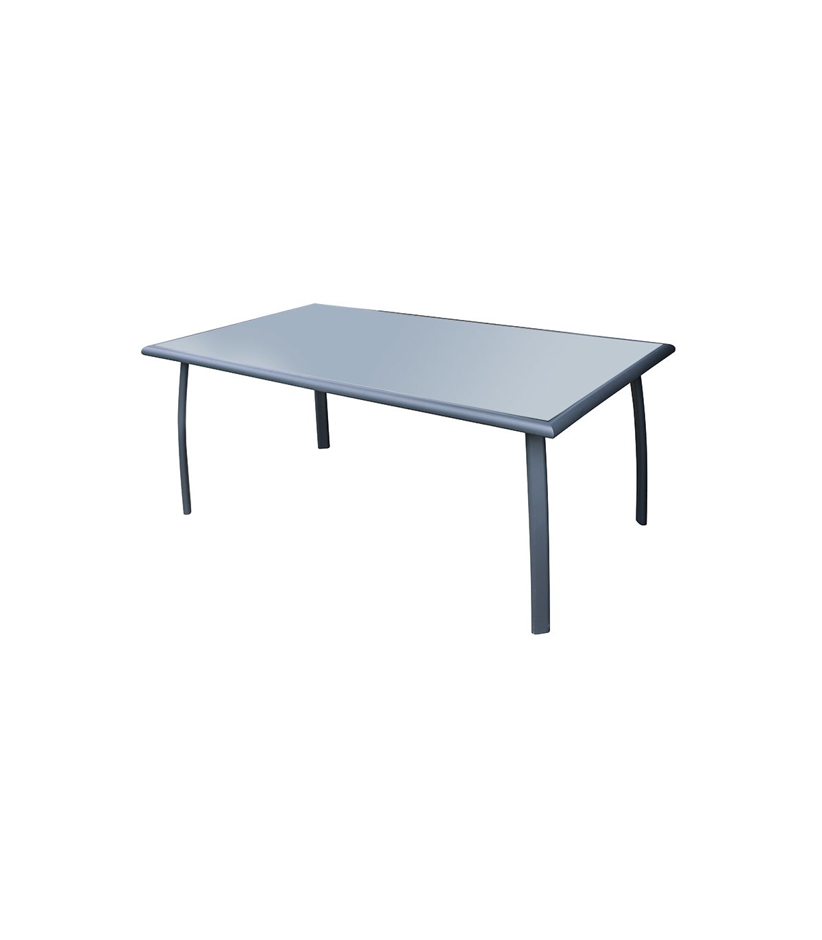 Fabricado en acero o aluminio color antracita. Mesa con superficie de cristal templado. Sillas con respaldo de textilene.