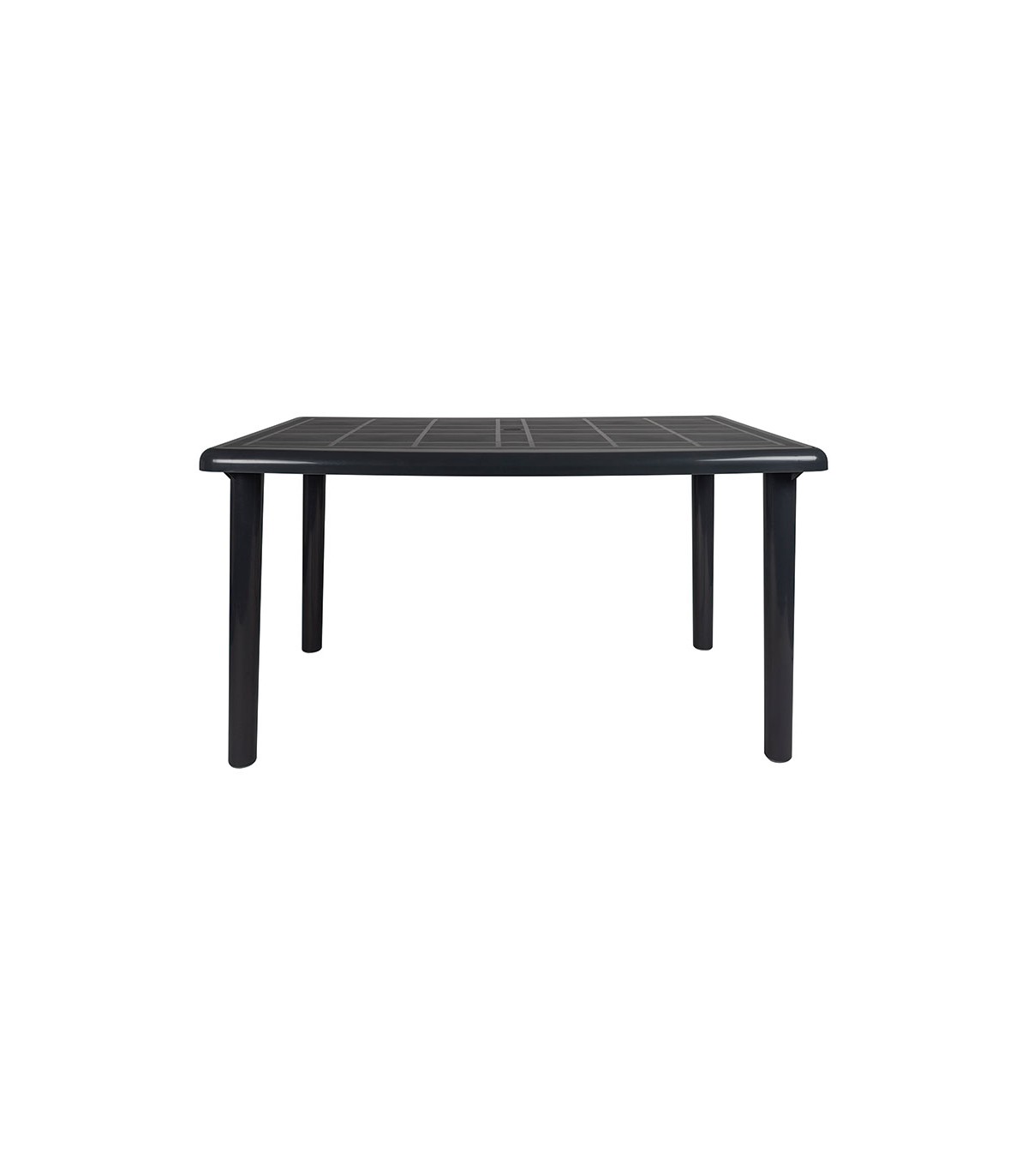 140x90xh.73 cm. Mesa rectangular fabricada con polipropileno reciclado y reciclable. Agujero para parasol de ø 38 mm. Peso neto 7,5 kg.