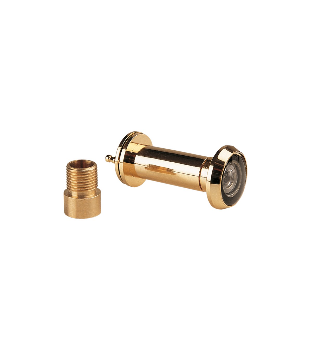 Cuerpo latón con baño de oro inalterable. 4 lentes cristal óptico. Arandela interior con tapa decorativa ø 22 mm. Super angular 200º. Cabezal ø 25 mm.