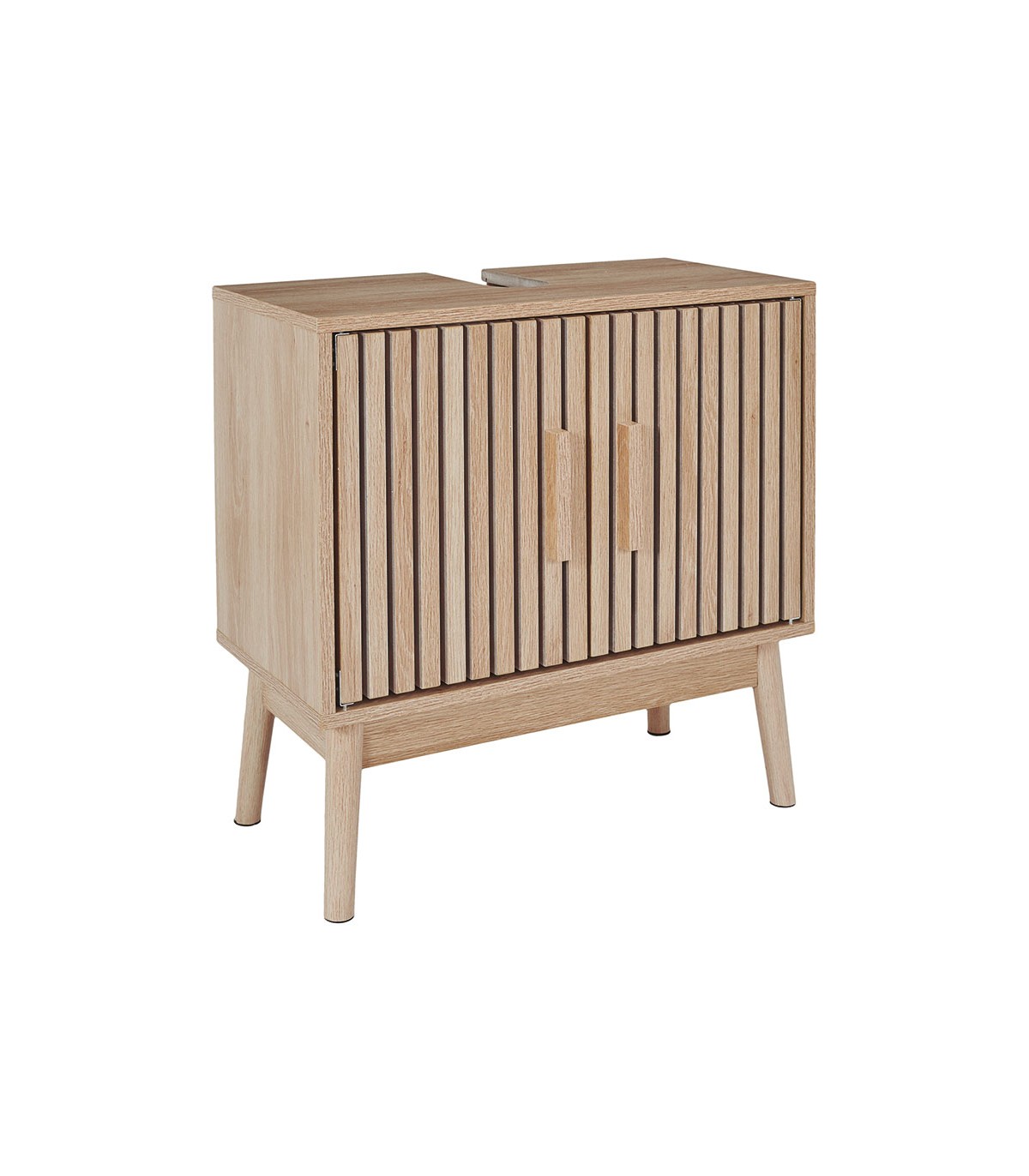 Fabricado en madera con acabado natural. Preparado para que puedas colocar el lavavamanos encima del mismo. Dispone de dos puertas y dos estantes en su interior.