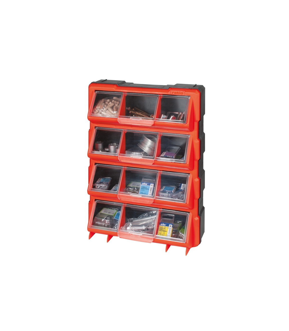 Estructura poliestireno de alto impacto. Cajones de polipropileno transparente. Módulos apilables entre si mismos. Sistema de fijació a pared. 12 compartimentos con tapa de policarbonato transparente. Asa integrada de transporte. Tapas con sistema de cierre que evita derrame.