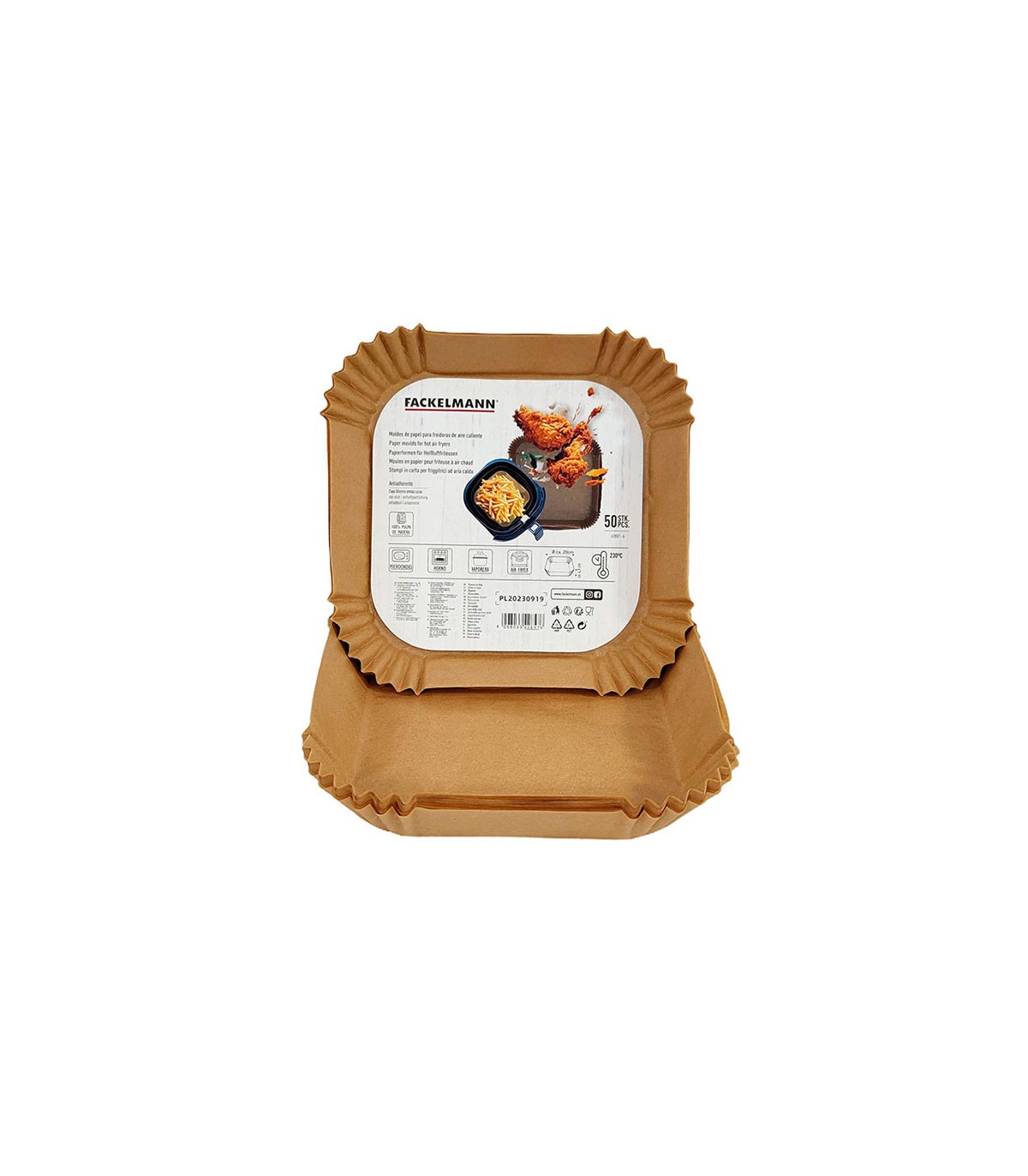 100% pulpa de madera con certificación FSC. Antiadherente. Capa de silicona en ambas caras. Apto para freidoras de aire, microondas, horno y vaporera admite temperaturas hasta 230ºC. Paquete 50 unidades.