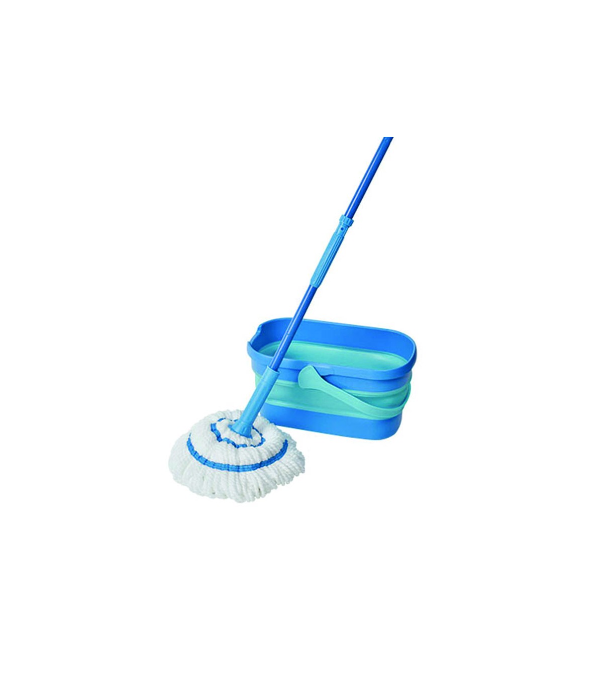 Set de cubo y fregona de microfibras con sistema de escurrido incorporado. Cubo plegable de 10 litros fabricado con un 30% material reciclado. Mango telescópico y desmontable. Diseño ultracompacto ahorra espacio.