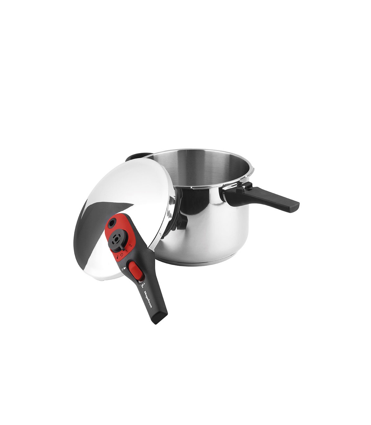 Acero inox 18/10. 5 sistemas seguridad. Cierre automático seguridad. Salida vapor vertical. Apto todo tipo cocinas. Mango negro y rojo.