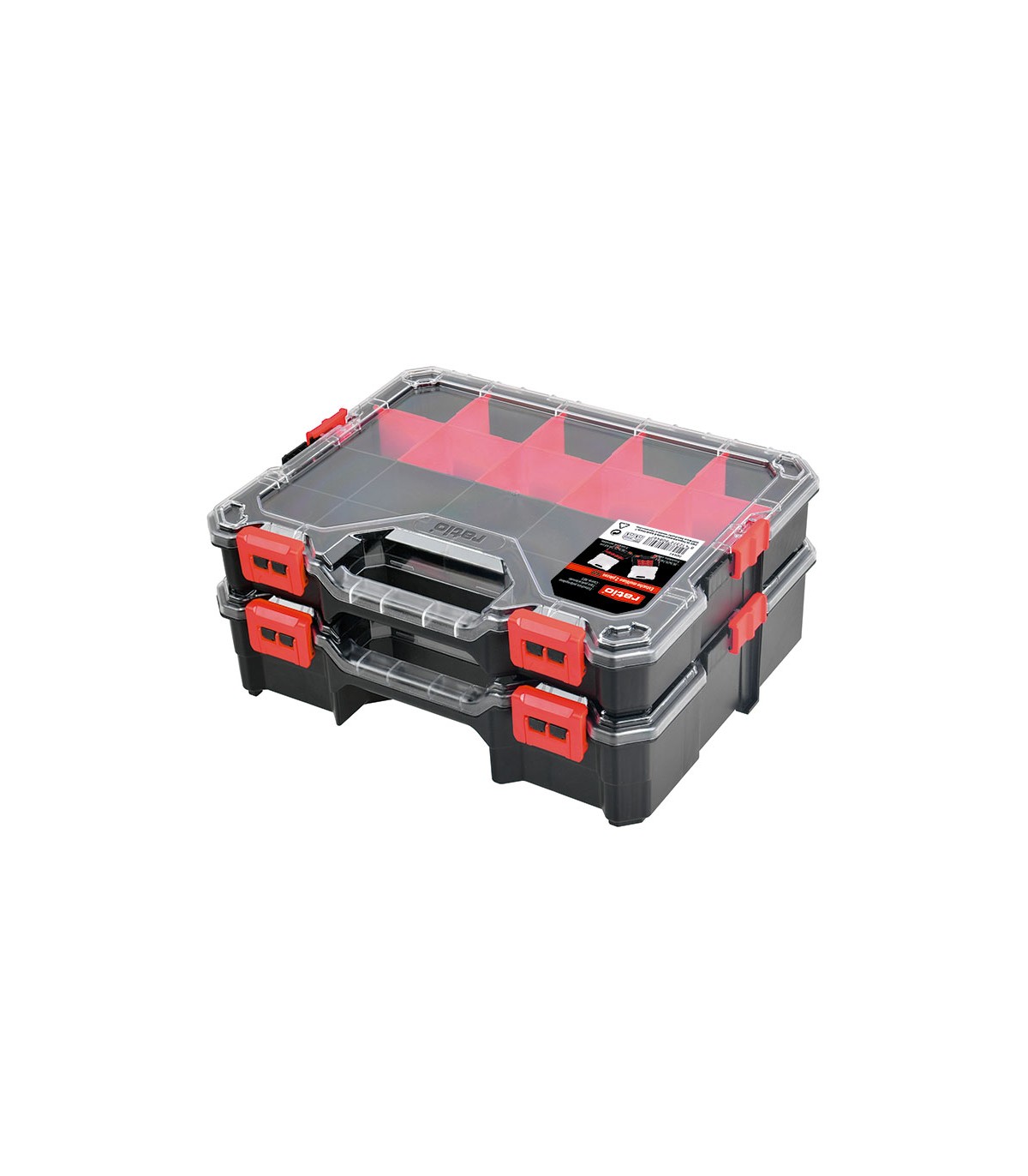 Estructura de polipropileno, tapa transparente de policarbonato y cierres en ABS. Un lado con tabique modulares extraíble (9 pzas) para personalizar los compartimentos, y el otro lado con 9 cubiletes removibles.