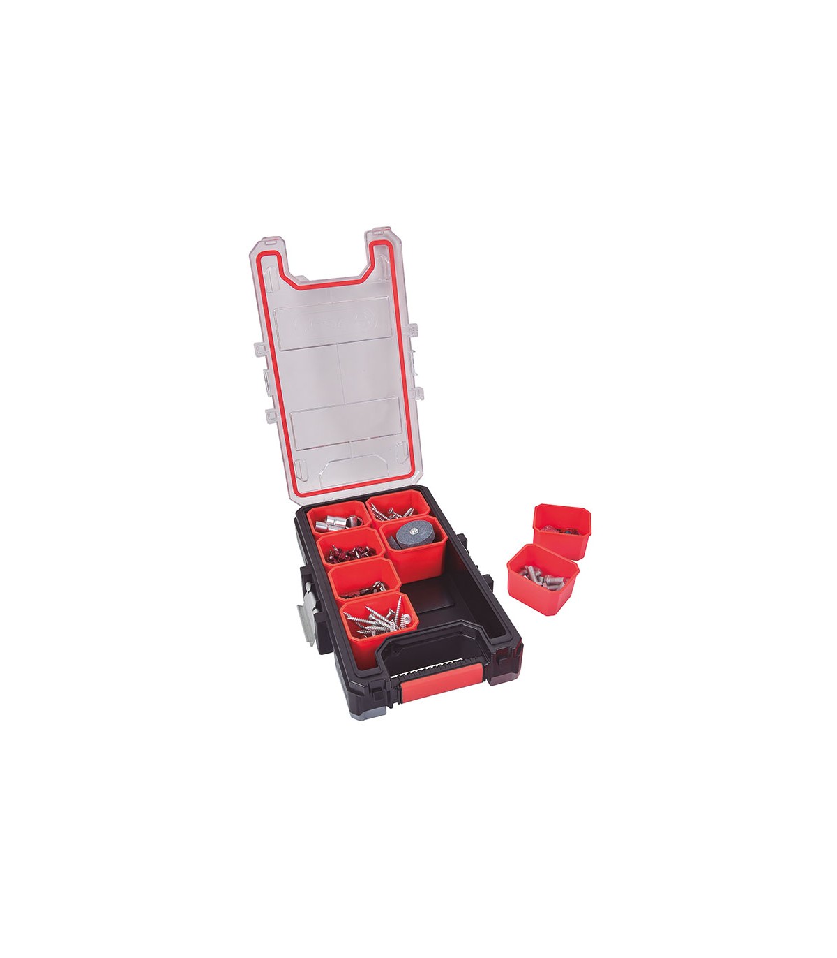 Organizador apilable mediante pestillos laterales. Estructura de polipropileno. Tapa transparente impermeable IP53 y cierres en aluminio. 8 cubiletes removibles. Esquinas protectoras de goma TPR . Empuñadura antideslizante.