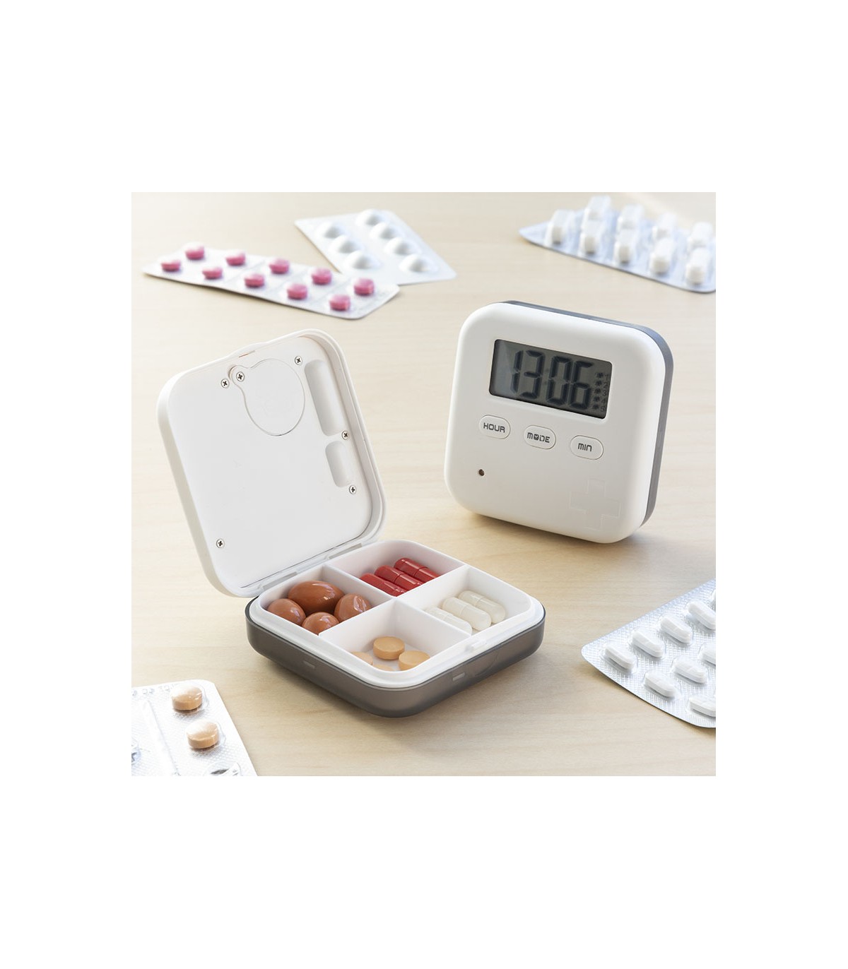 ABS/PP. Triple función: alarma, reloj y cronómetro. 5 alarmas sonoras y vibración programables. 4 compartimentos. Cierre hermético. 1 pila CR2032 incluida.