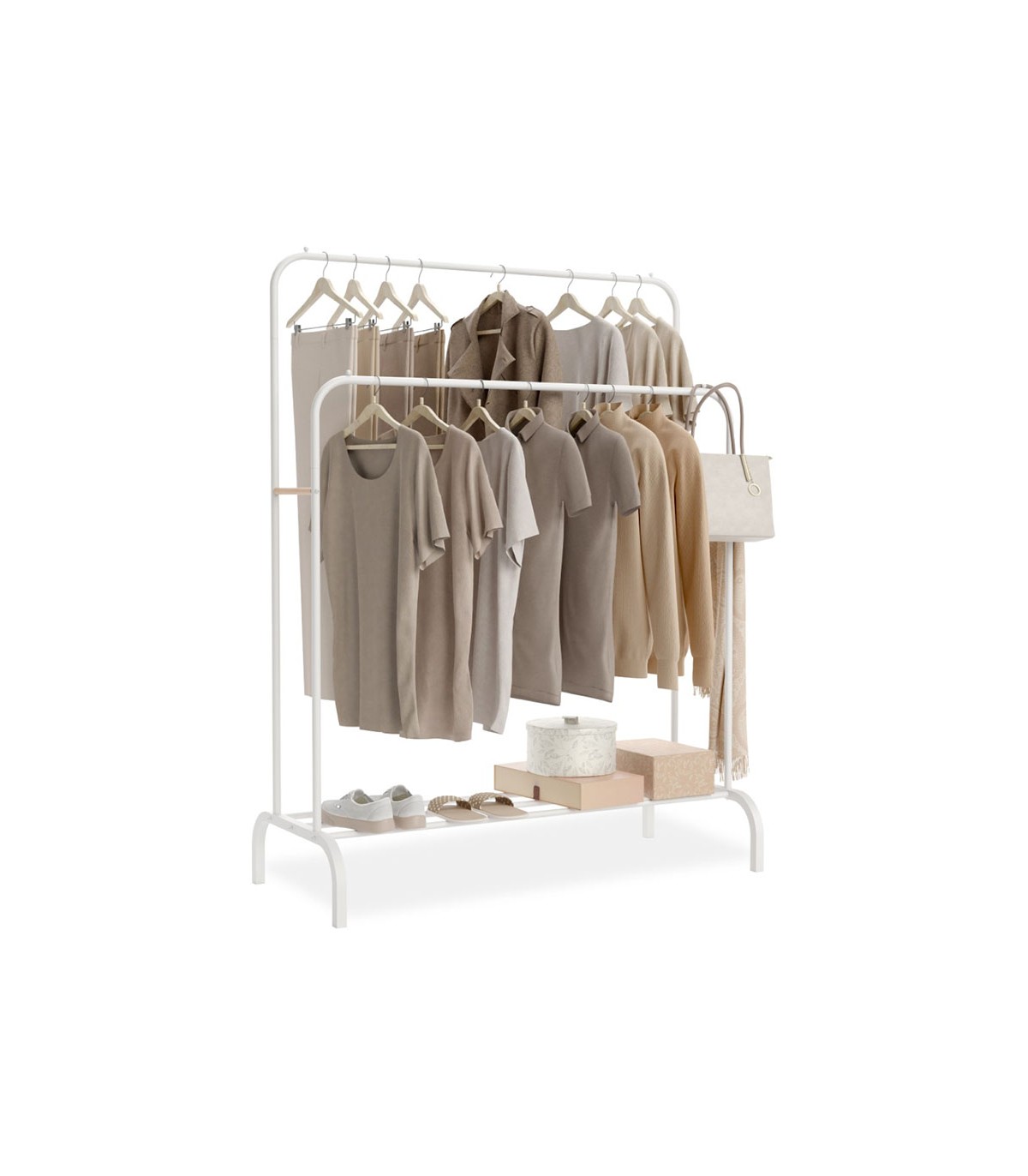 2 alturas: 131 y 101,5 cm. Ancho 92,5 cm. nivel 1 y 98,5 cm. nivel 2. Incluye zapatero: estante adicional en la parte inferior de 109,5 cm. Multifuncional: perchero, zapatero y tendedero de interior. Base antirayaduras y topes antideslizantes: incluye 4 almohadillas de protección. Diseño compacto y portátil. Fácil montaje. Soporta hasta 30 kg. Color blanco.