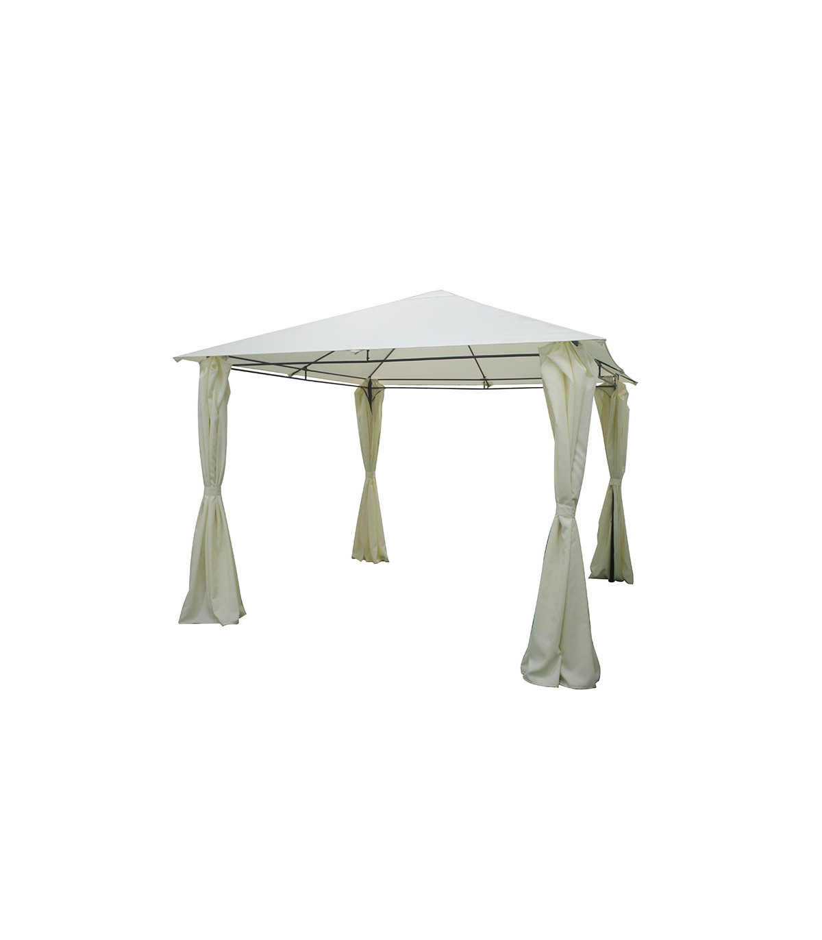 Estructura metálica gris antracita. Postes ø 38 mm. Toldos poliéster crudo. Cierre cortinas laterales.