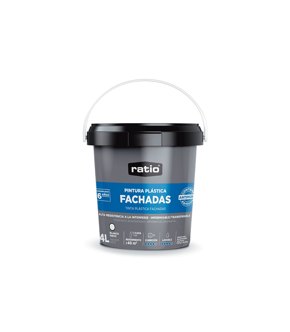 Revestimiento para renovación y protección de exteriores, fachadas e interiores. Antihumedad, antimoho y lavable. Rendimiento: hasta 10 m2/l, secado al tacto: 1 h, repintado: 6 h. Revestimiento protector anticarbonatación impermeabilizante y decorativo de estructuras y fachadas de hormigón, mortero, ladrillo, piedra, etc. Blanco nieve.