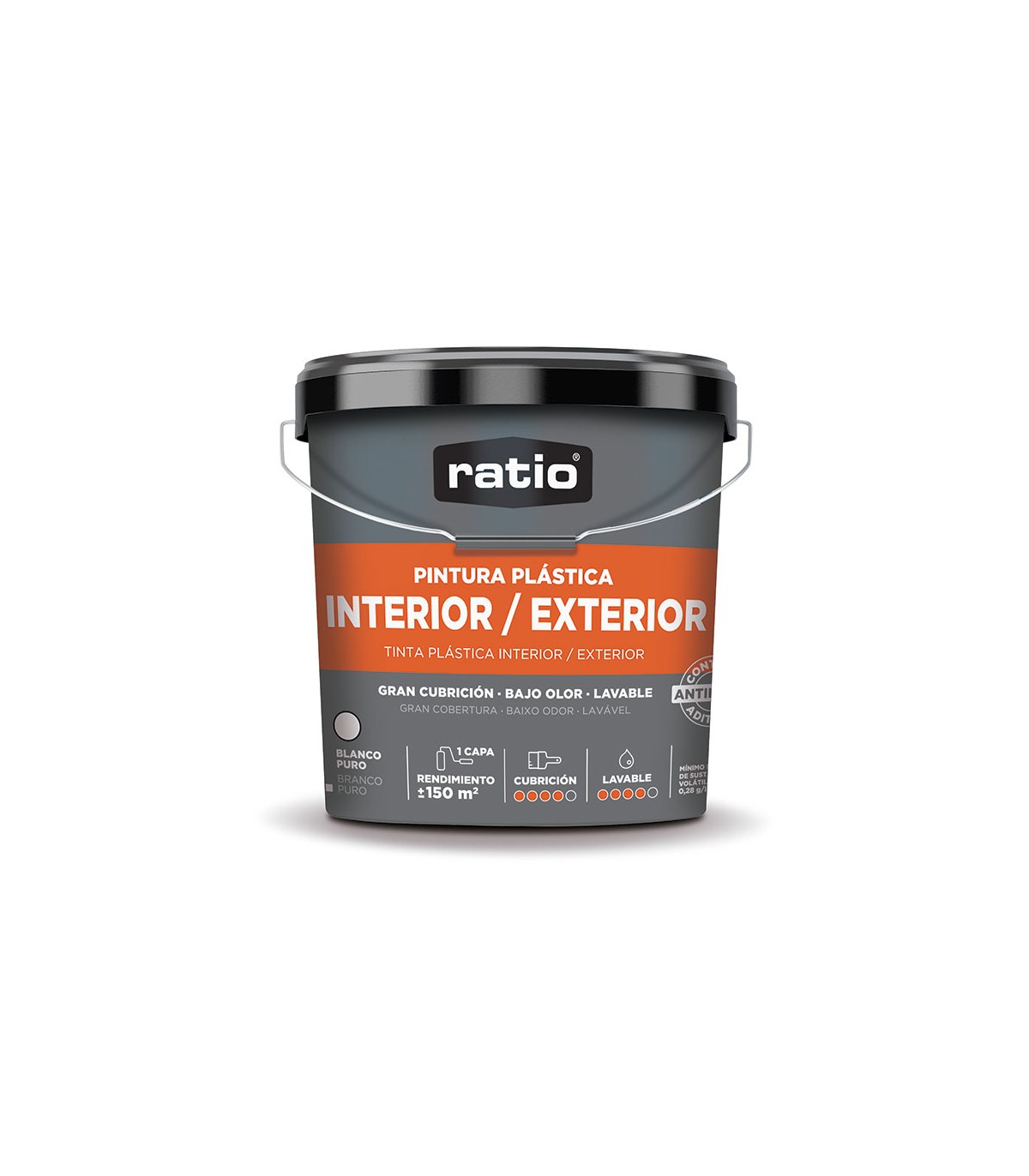 Pintura plástica de olor suave para interiores. Antimoho y lavable. Rendimiento: hasta 10 m2/l, secado al tacto: 1 h, repintado: 4 h. Ideal para todo tipo de superfícies de interiores y exteriores, gran adherencia para cualquier material de construcción, transpirable y acabado de calidad. Blanco puro.