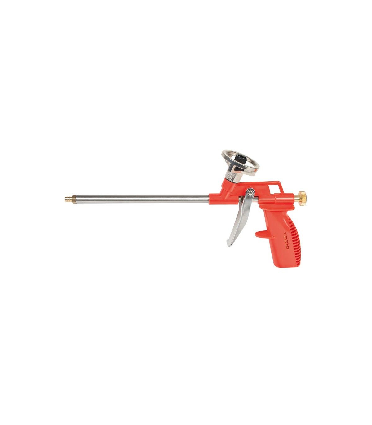 Cuerpo de polipropileno. Tambor interior acero inox. Rosca universal. Flujo de material regulable. Incluye 2 tubos extensores 18 cm y 2 tubos 4,5 cm con punta cónica para formación de espuma en espacios estrechos.