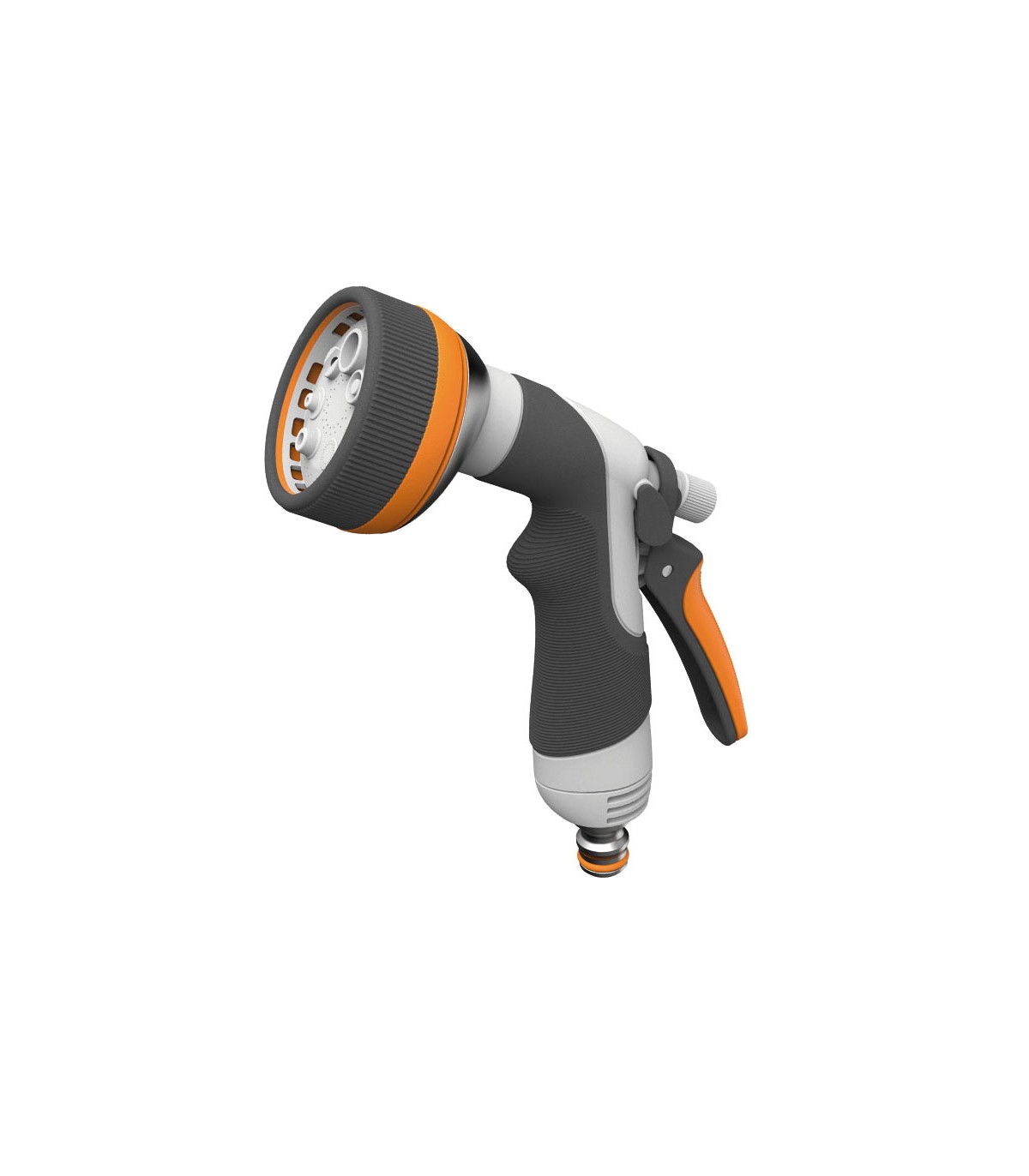 Cuerpo metálico con componentes soft touch. Máximo caudal 10 litros por minuto. Presión 4 bares. Interruptor de flujo plano.