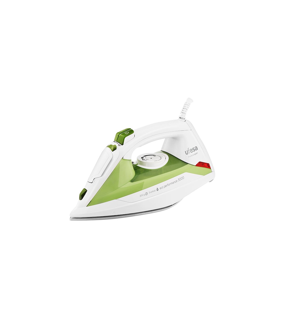 Eco Performance 3000: resultados de 3000 W con un consumo de 2400 W. Suela Anodized 360º: gran resistencia al rayado y deslizamiento perfecto. Sistema 3 antical (1 - Autolimpieza, 2 - Golpe antical, 3 - Cartucho antical). Depósito 320 ml. Antigoteo. Planchado vertical. Permite planchado con vapor o en seco. Spray pulverizador.