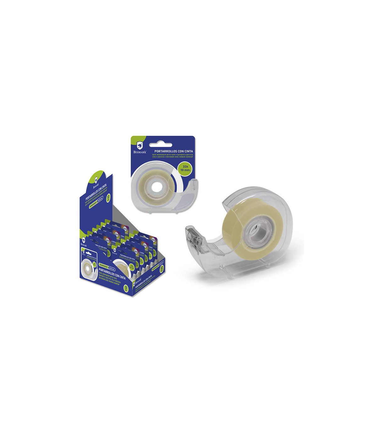 Portarrollos con cuerpo de plástico. Incluye cinta adhesiva transparente de 33 m.