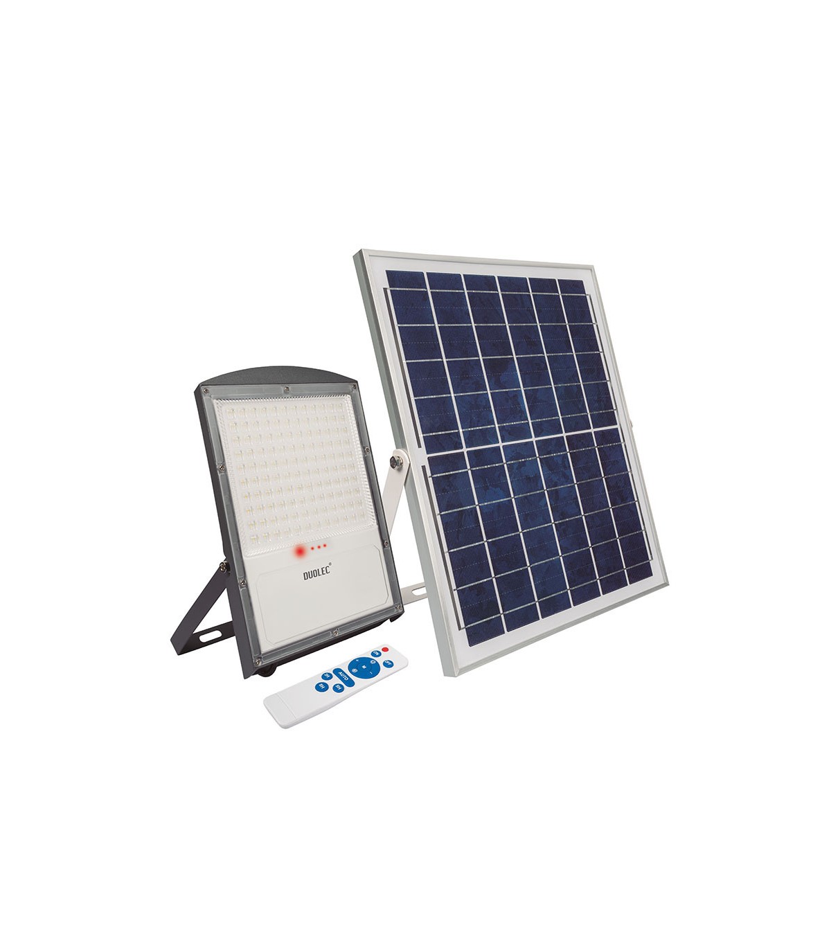 Aluminio y cristal. Vida útil 36.000 horas. 6500K. Sensor crepuscular. IP65 que lo hace ideal para zonas de exterior. IK 7. Orientable. Incluye panel solar con cable de 5 m. Mando a distancia. 100% de lúmenes durante las primeras 3h, un 75% durante las siguientes 2h y un 50% en las últimas 5h. Indicador nivel carga batería. Baterías 48 h autonomía.