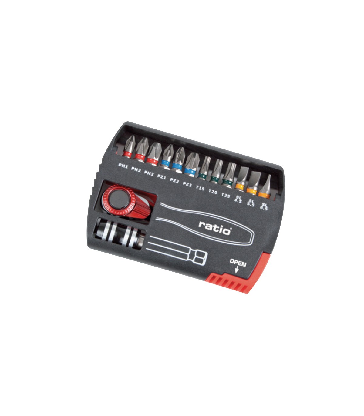 Estuche 14 accesorios. Llave mini-carraca reversible para puntas de atornillado. Adaptador magnético de ajuste rápido. Puntas torsión acero S2 con anillo de color.
