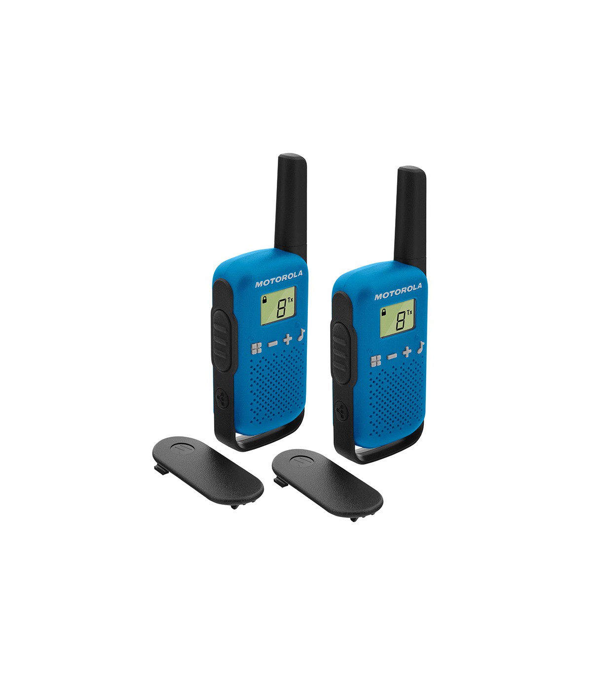Dispone de 16 canales de comunicación. Incluye: 2 walkie-talkies, 2 clips de cinturos. 16 adhesivos para personalizarlo. Funciona con 3 pilas AAA no incluidas por terminal. Alcance 4 km. Uso sin licencia.