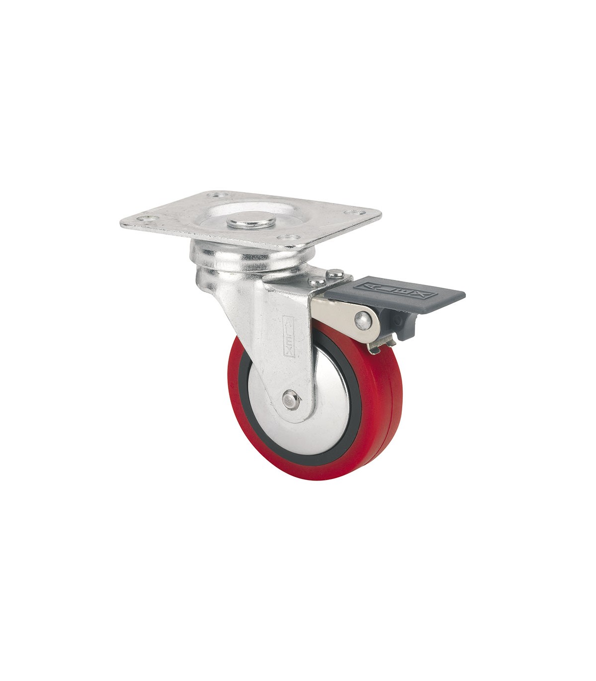 Rueda roja poliuretano inyectado blando. Cojinete liso. Recomendada para interiores. Silenciosa e indeformable.