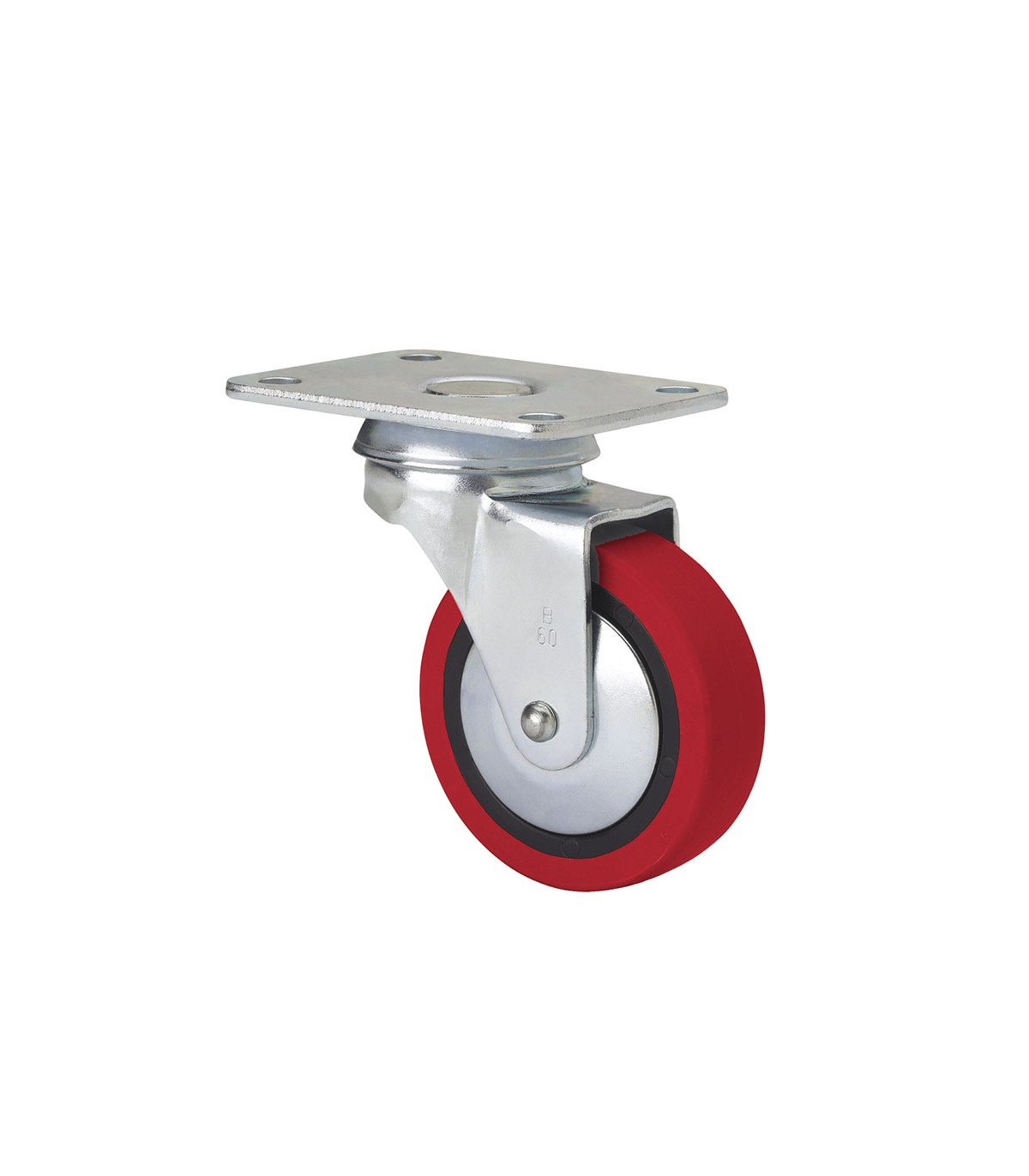 Rueda roja poliuretano inyectado blando. Cojinete liso. Recomendada para interiores. Silenciosa e indeformable.