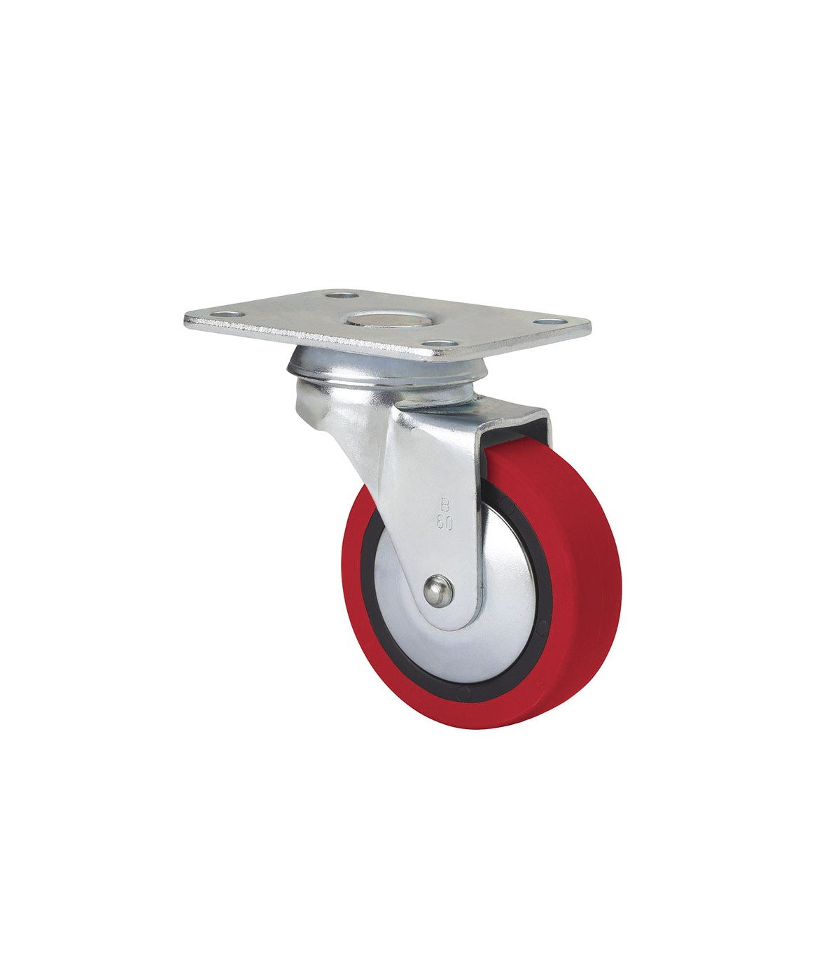 Rueda roja poliuretano inyectado blando. Cojinete liso. Recomendada para interiores. Silenciosa e indeformable.