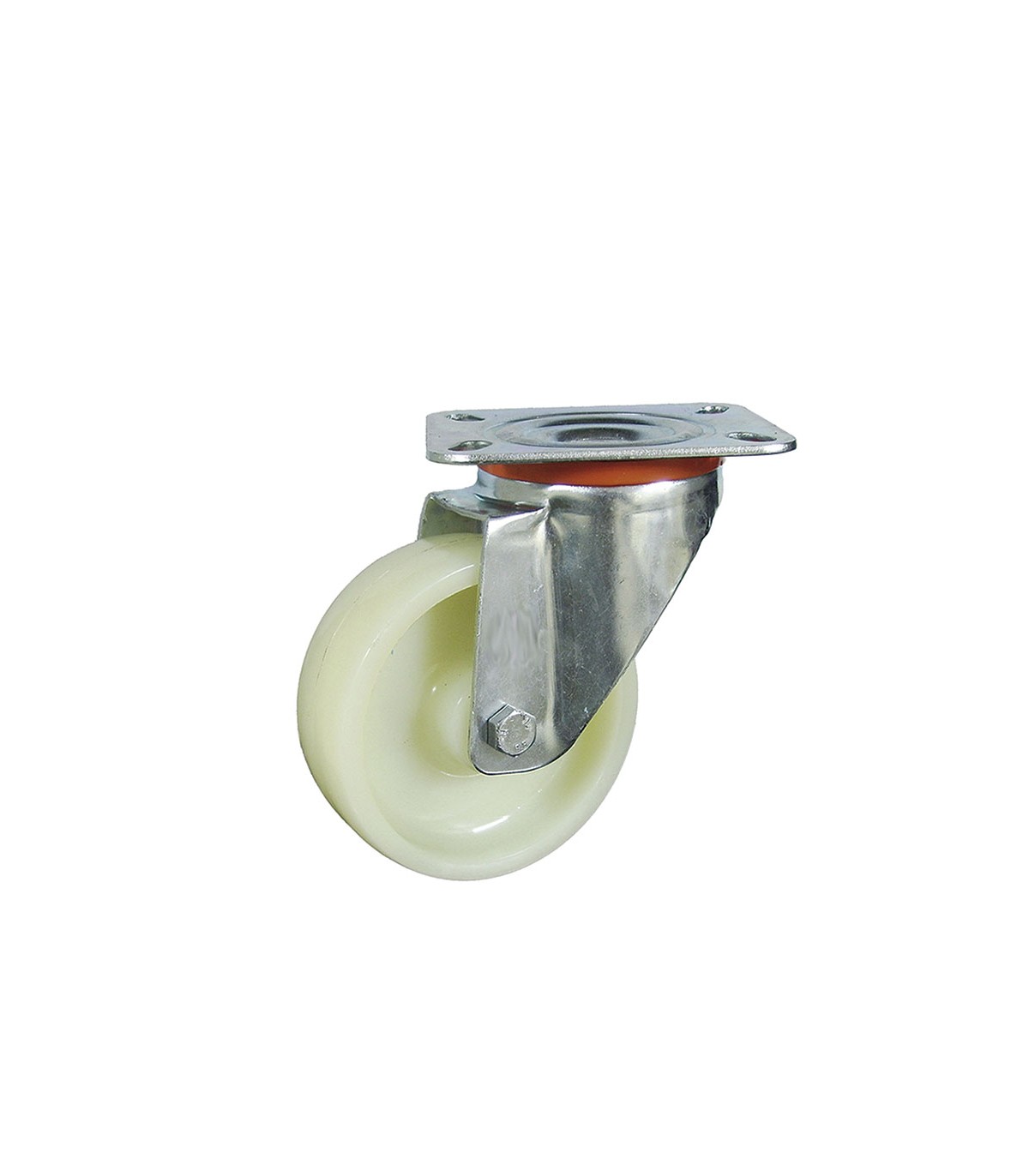 Pletina giratoria cincada. Aro monobloque de nilón inyectado. Buje con taladro liso.