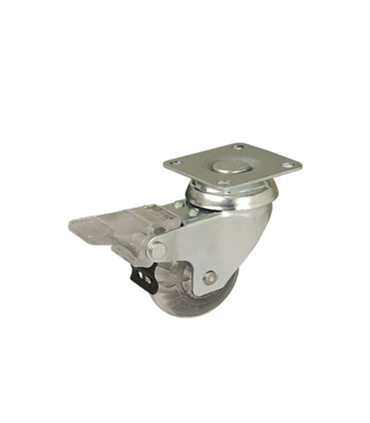 Rueda giratoria de acero estampado de 2 mm de espesor con acoplamiento por medido de pletina. Base de sujeción horizontal. Doble hilera axial de bolas de acero en el rodamiento. Acabado cincado blanco brillante. Aro de poliuretano traslucido. Dispositivo de freno de acción simple, freno único y exclusivo del giro del aro.