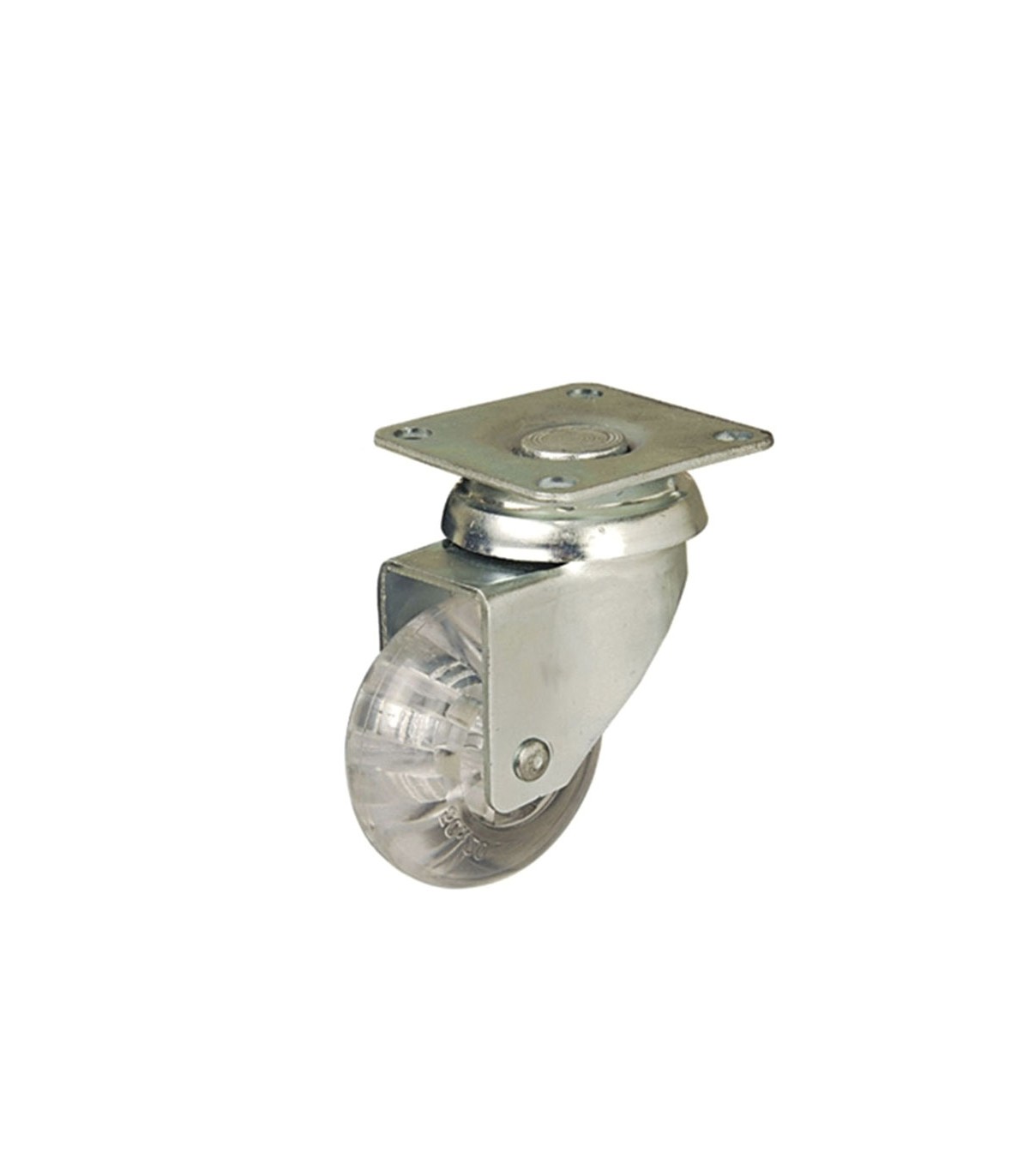 Rueda giratoria de acero estampado de 2 mm de espesor con acoplamiento por medido de pletina. Base de sujeción horizontal. Doble hilera axial de bolas de acero en el rodamiento. Acabado cincado blanco brillante. Aro de poliuretano traslucido. Dispositivo de freno de acción simple, freno único y exclusivo del giro del aro.