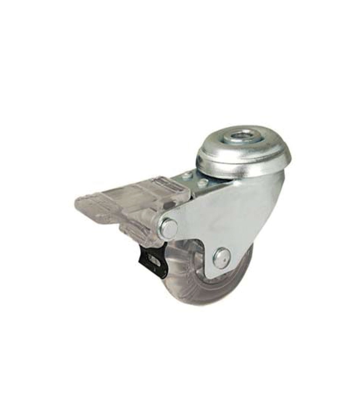 Rueda giratoria de acero estampado de 2 mm de espesor con acoplamiento por medido de pletina. Base de sujeción horizontal. Doble hilera axial de bolas de acero en el rodamiento. Acabado cincado blanco brillante. Aro de poliuretano traslucido. Dispositivo de freno de acción simple, freno único y exclusivo del giro del aro.