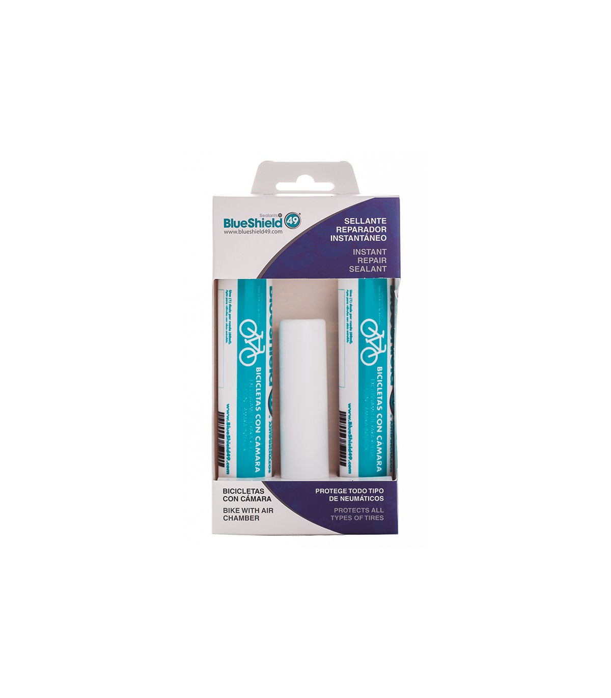 Reparador de pinchazos y sellante preventivo para ruedas tubeless o con cámara. Pack para 2 ruedas: 2 monodosis de 60 ml, extractor de obús, tubo de conexión, 2 tapones azules y guía de instalación producto.