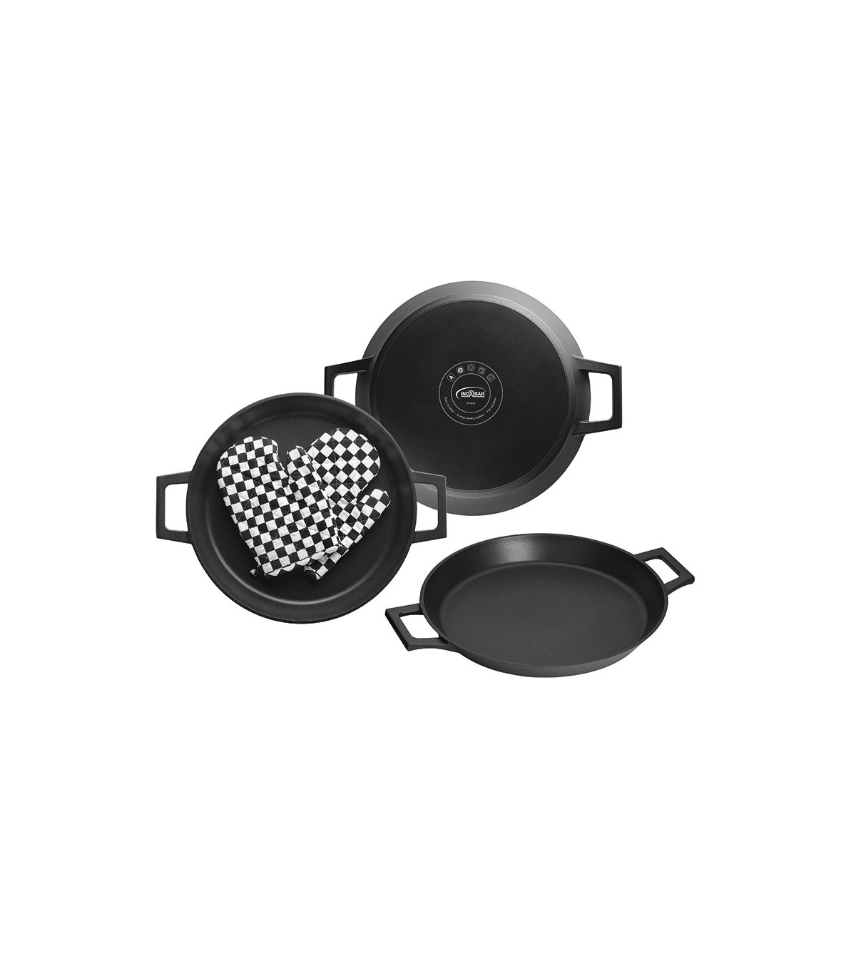 Aluminio fundido indeformable. Fondo 6 mm. Recubrimiento antiadherente Greblon C2, libre PFOA. Apto para lavavajillas. Mangos ergonómicos tacto soft touch. Tapadera de cristal con aro metálico. Fondo full induction. Para todo tipo de cocinas..