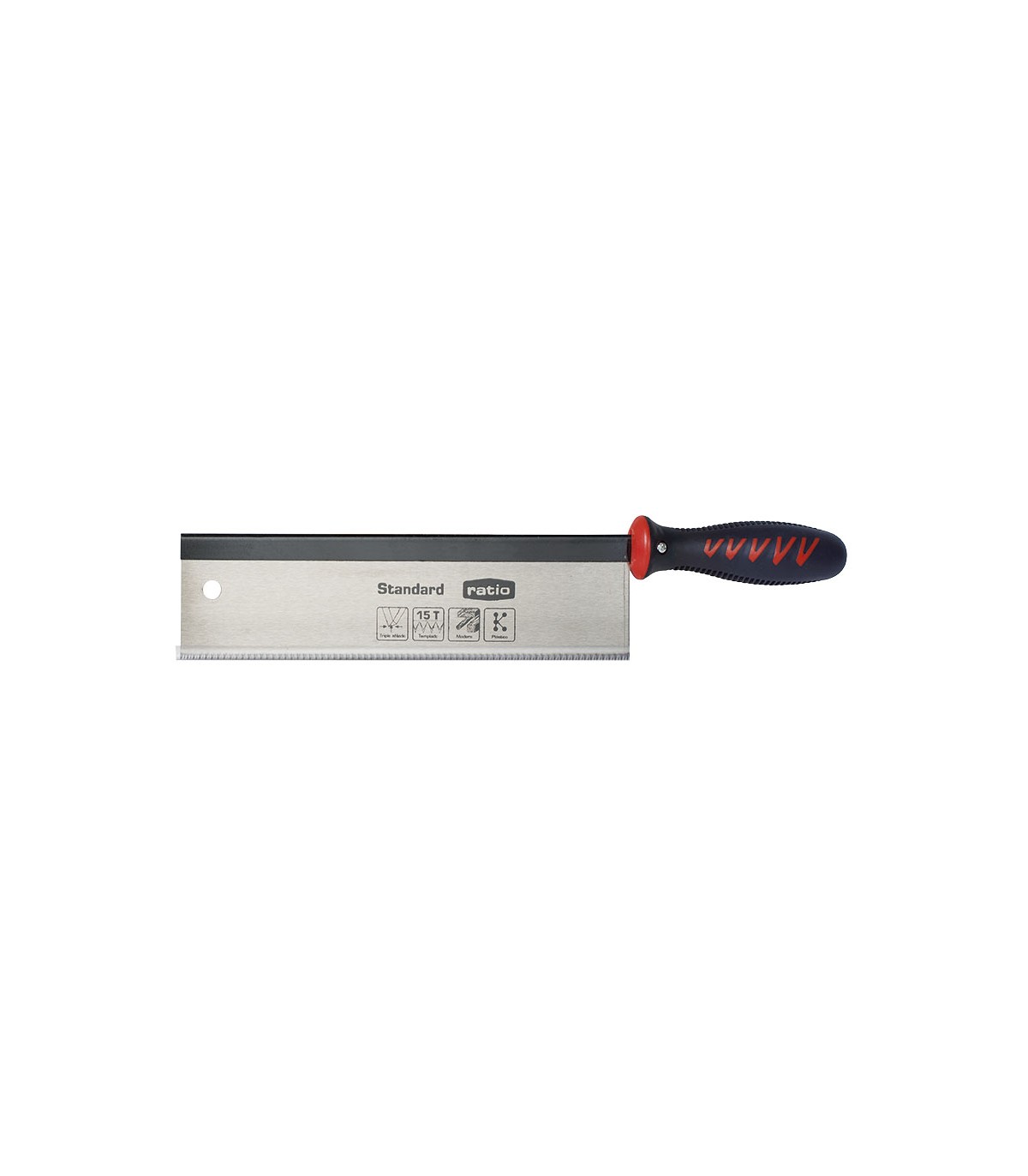 Dentado templado fino triple. Afilado recto (15TPI). Mango bimaterial antideslizante. Incluye protector de filo.