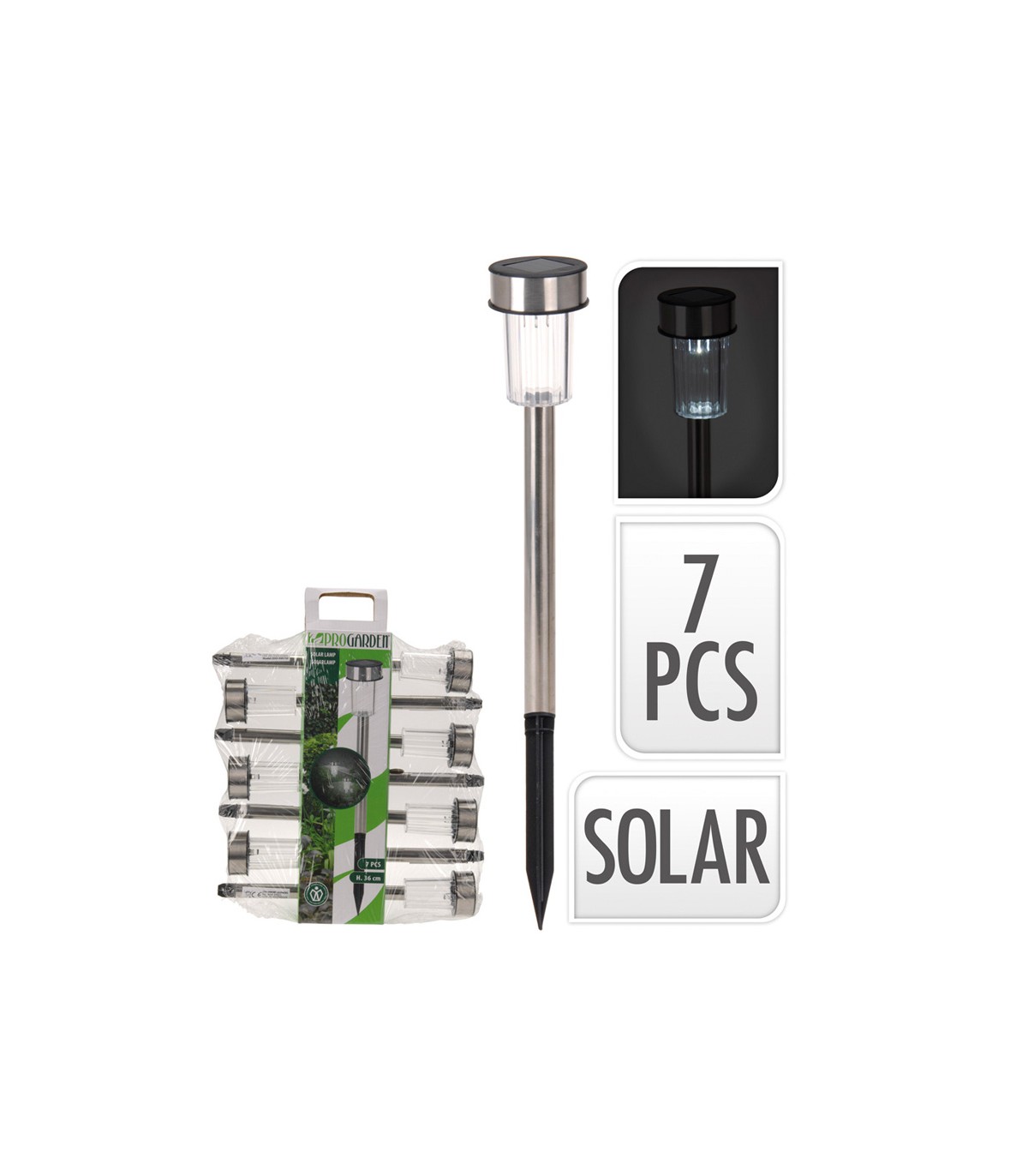Luz solar, acero inoxidable, juego de 7 piezas, longitud del tubo 18 cm, 1 LED blanco frío, batería recargable no reemplazable Ni-MH 40 mAh tipo botón, con interruptor.