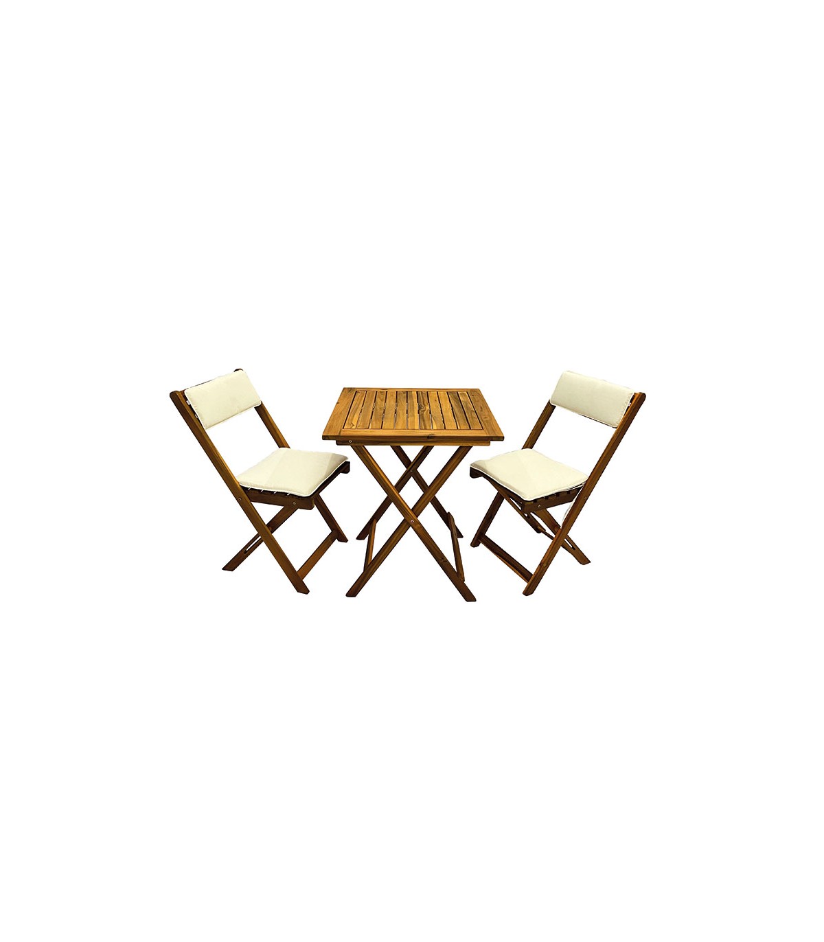 Estructuras de silla y mesa en madera. Silla y mesa plegables. Cojín y respaldo en color beige.
