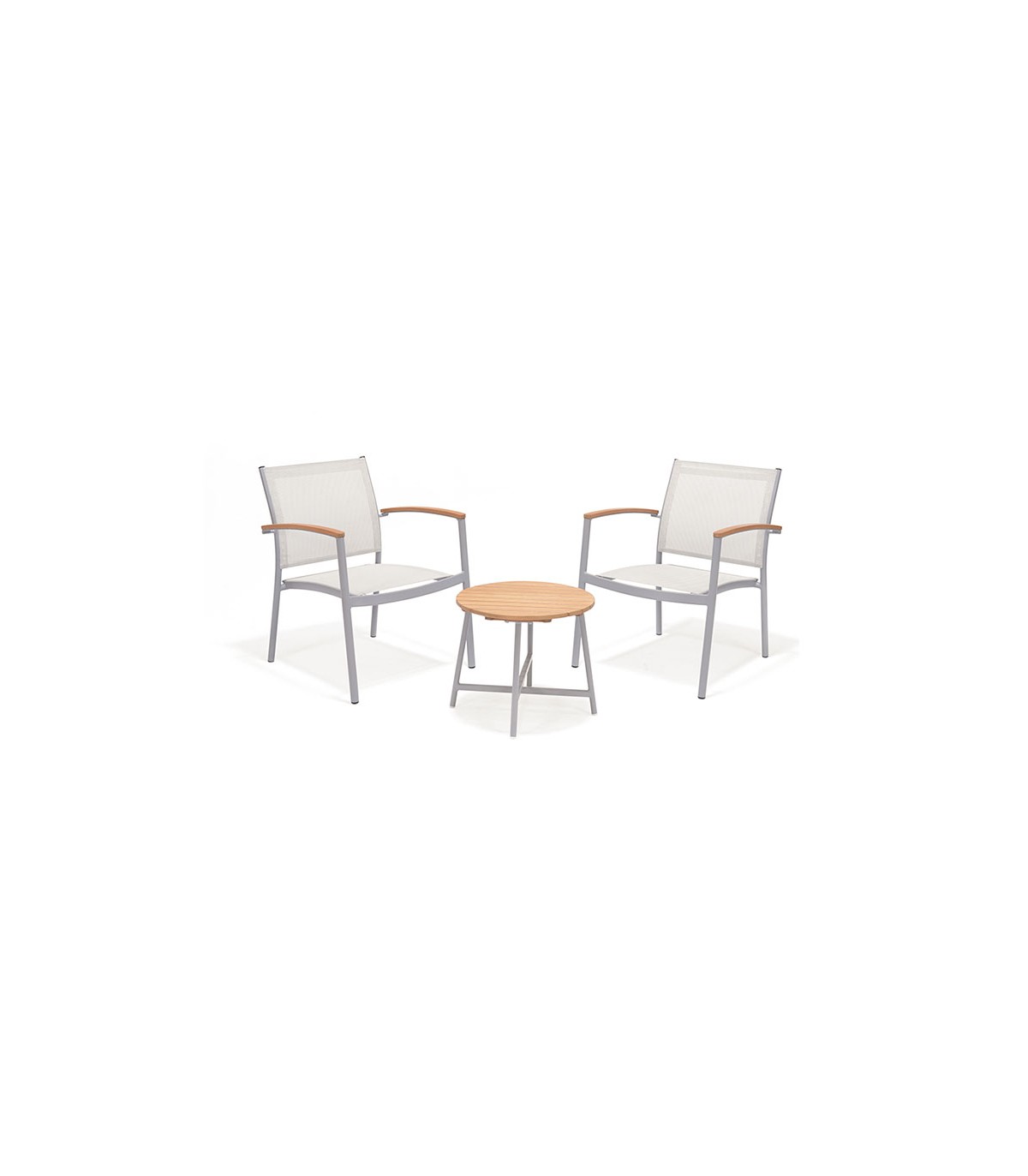 Estructuras en aluminio color gris mate. Asiento y respaldo en textilene color beige. Reposabrazos y sobre de mesa en madera de eucaliptus acabado imitación color teca. .
