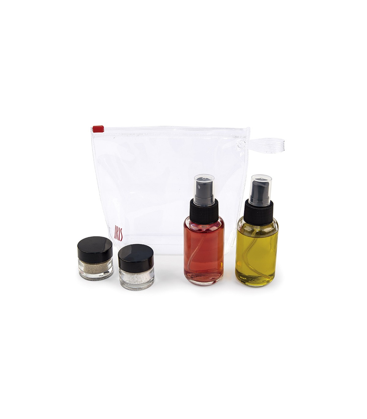 2 botellas con difusor y 2 recipientes con tapón. Bolsa transporte.