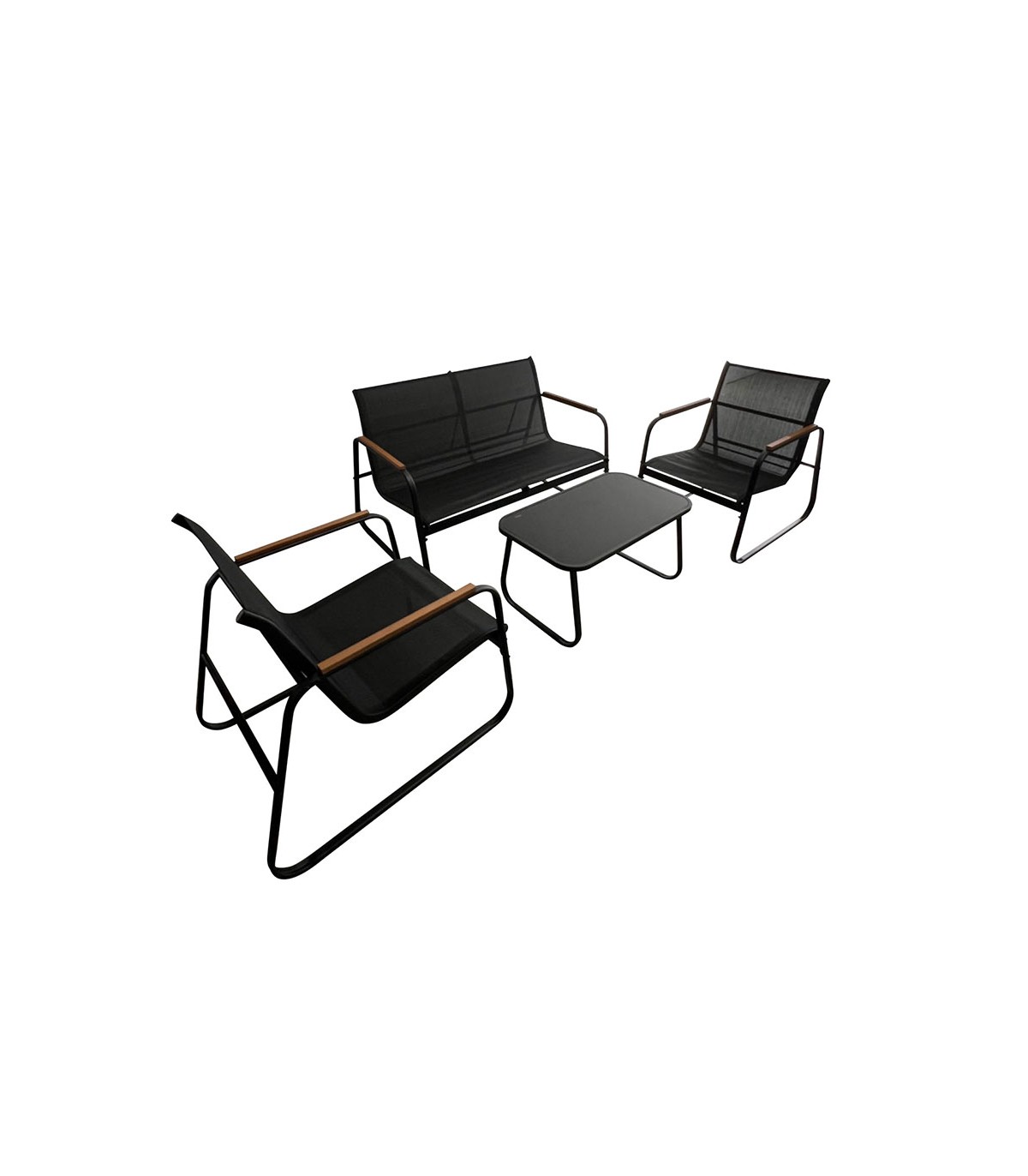 Estructura metálica color negro. Recubrimiento en polvo. Tela textilene. Sobre mesa vidrio templado. Reposabrazos de madera.