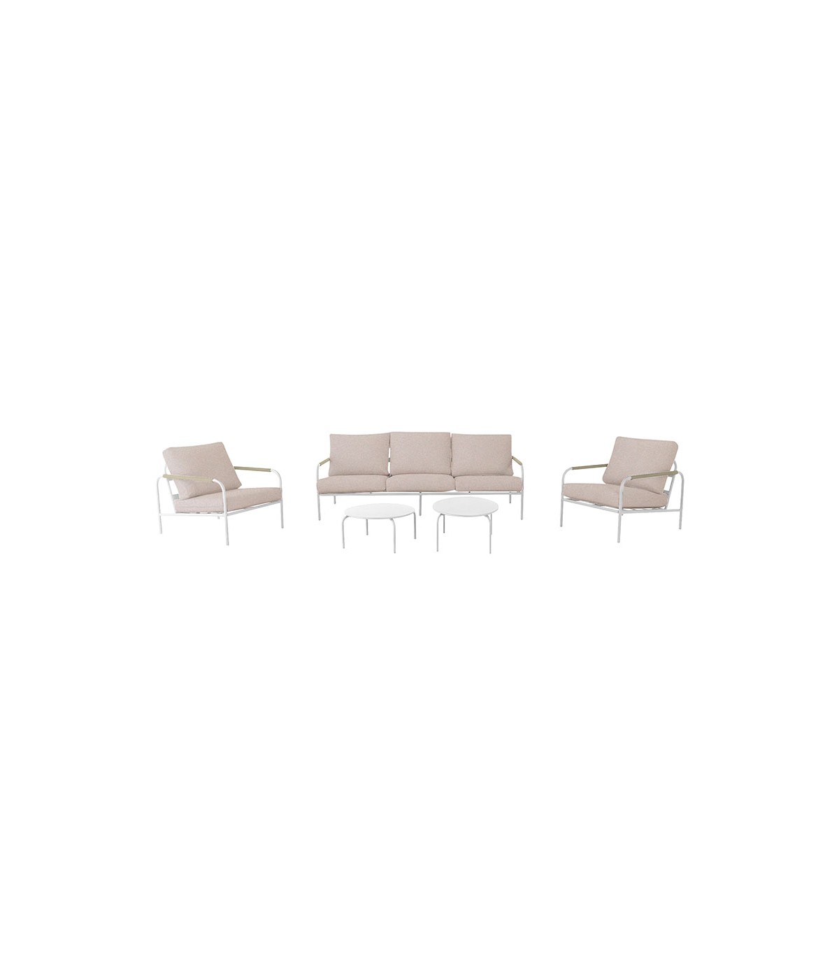Estructura en acero ø 25 mm color blanco. Reposabrazos con decoración de cuerda color beige de 5 mm. Cojines en poliéster color natural texturizado.