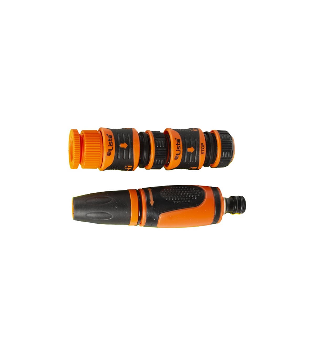Conector de grifo, lanza de riego y 2 conectores rápidos, uno con cierre automático válvula aqua stop.