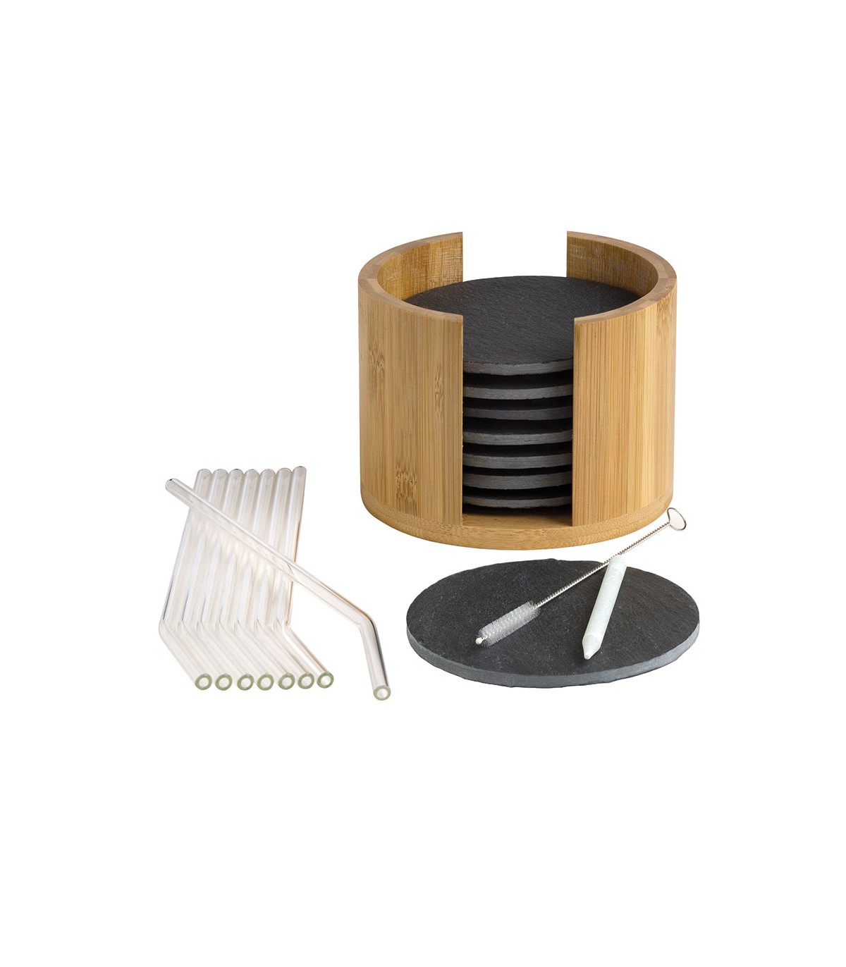 8 posavasos de pizarra, 8 pajitas de cristal, un soporte de bambú, cepillo de limpieza y tiza. ø 10 cm.