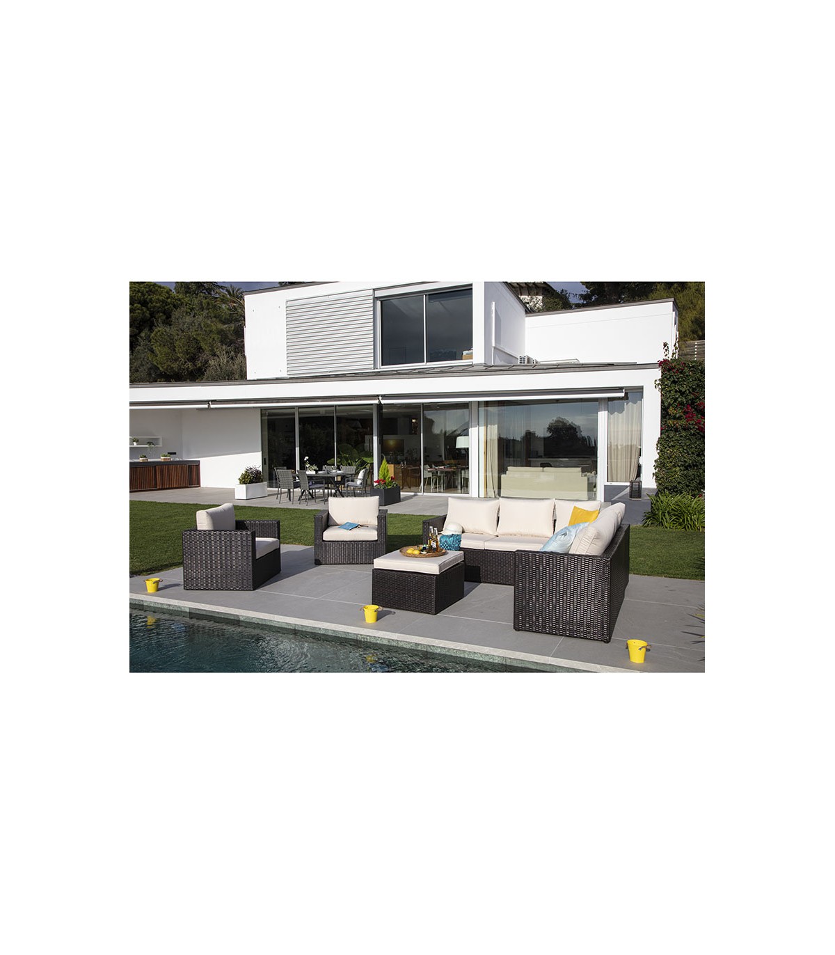 Estructura metálica/ratán sintético plano. Cojines de poliéster color crudo incluidos. Para completar la colección disponemos del sillón individual de esta misma serie referencia 8704N273 que se vende por separado.