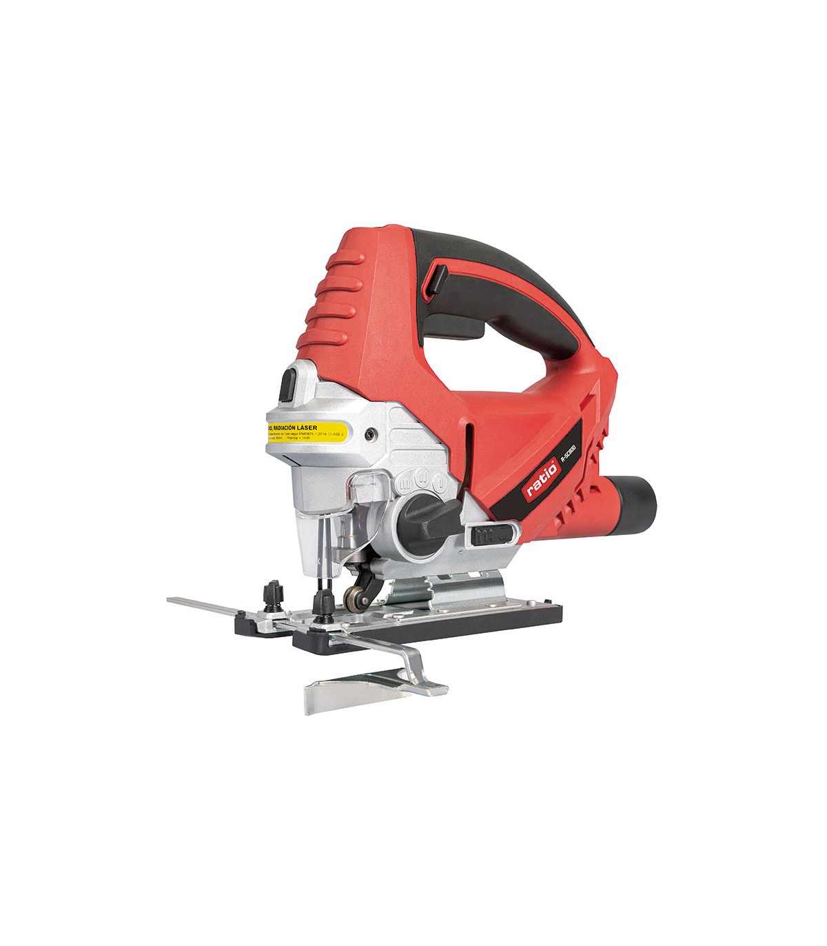 Guía láser. Regulación electrónica de 6 velocidades. Pendular 3 posiciones. Guía lateral ajustable hasta 15 cm. Base aluminio con protector de goma. Cambio rápido de cuchilla con inserción T (tipo Bosch).