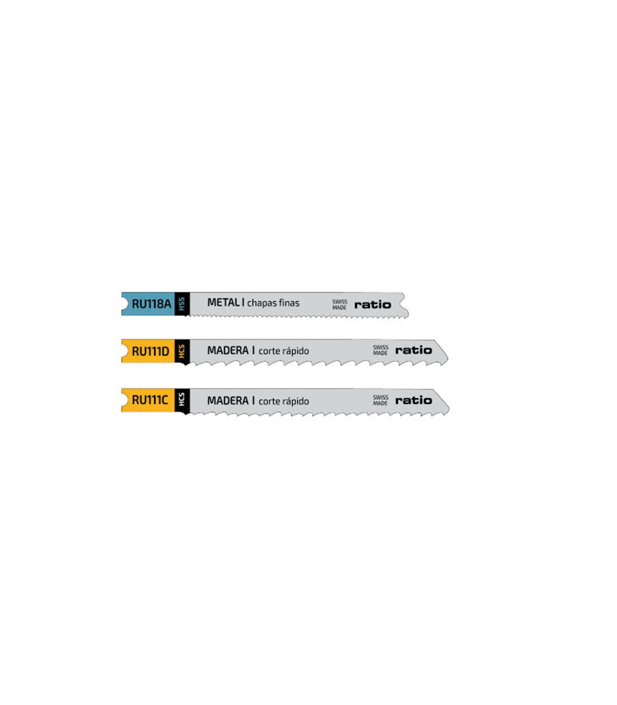 Para madera y metal. 2 sierras RU118A. Chapas finas (1-3 mm). 1 sierra RU111D. Madera blanda, tablas de virutas prensadas, de madera estratificada, tableros de fibra. (5-65 mm). 2 sierras RU111C. Madera blanda, tablas de virutas prensadas, de madera estratificada, tableros de fibra. (4-50 mm).. . . .