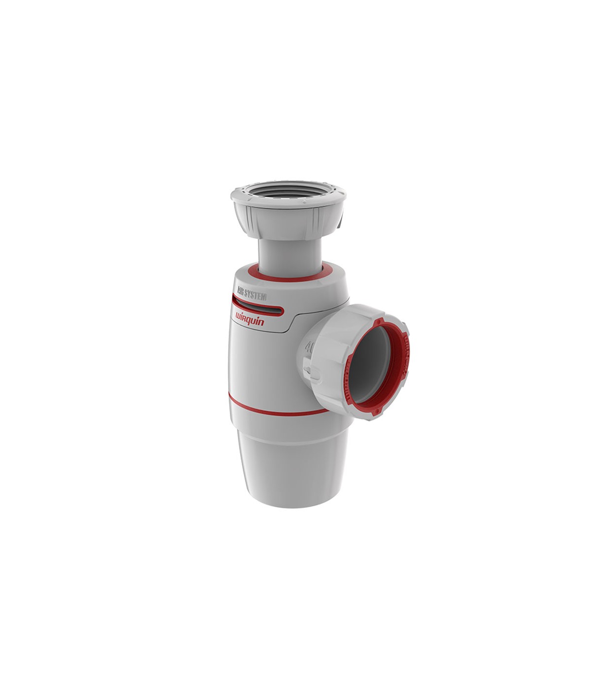 Salida horizontal. Función air system que permite una ventilación constante del sifón y evita los ruidos y olores. Juntas moldeadas para una estanqueidad total. Instalación rápida mediante tuerca 1/4 de vuelta unida al sifón.