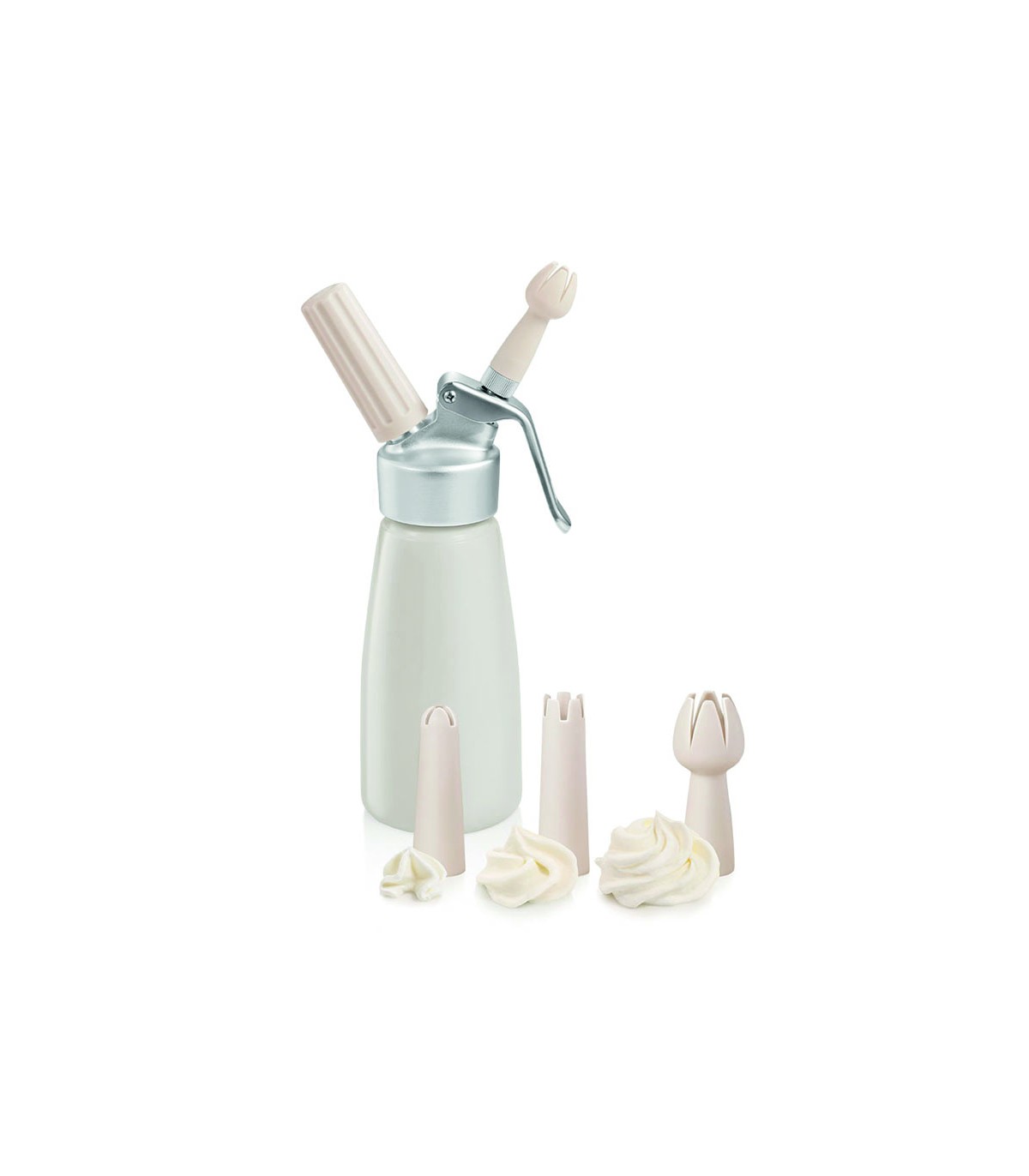 Sifón para espumas y nata montada totalmente metálico con 3 boquillas decoradoras. Fabricado de aluminio seguro (EN 610), plástico resistente y silicona de primera calidad. 10 pzs. No apto para lavavajillas. Garantía de 3 años.