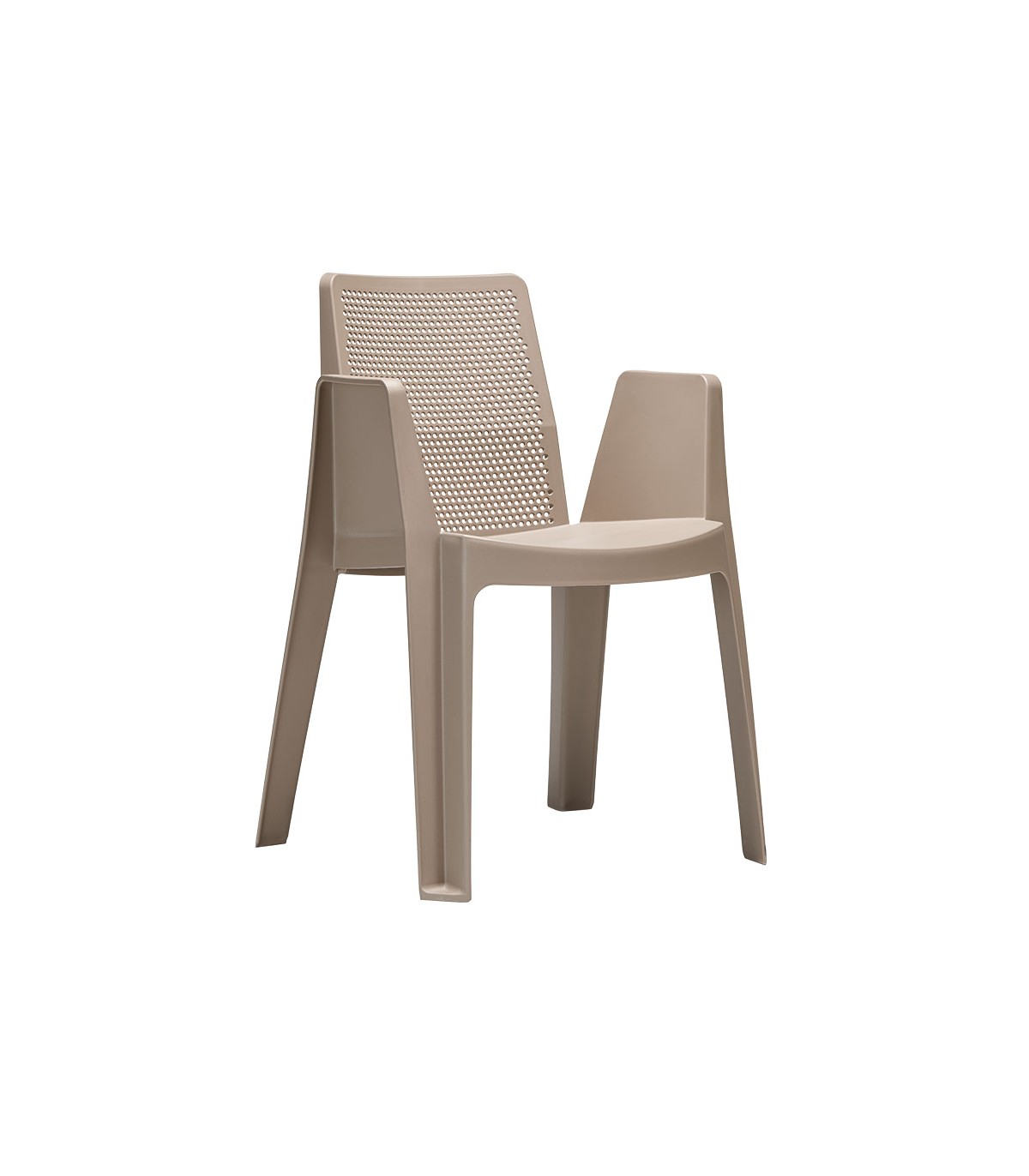 Inyectada en polipropileno. Apilable. Protección UV. Silla ligera 2,8 kg. 56,5x54,5xh.78 cm. Altura asiento: 44 cm. Altura brazos: 65 cm.