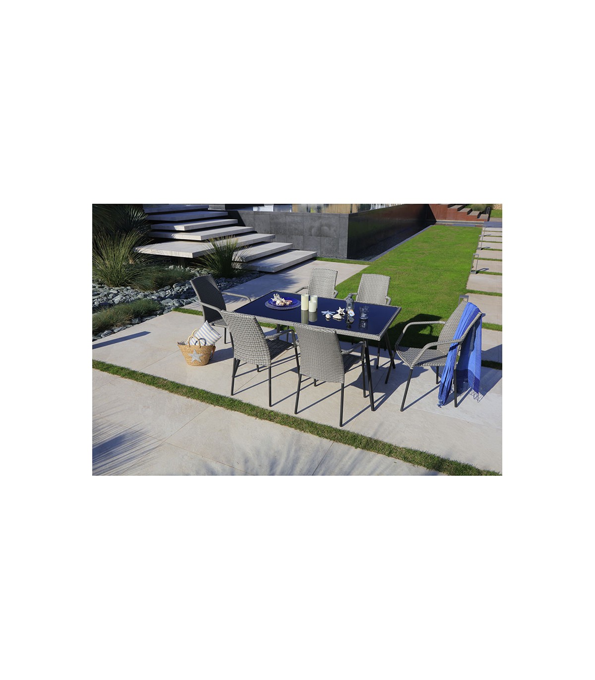 Estructura metálica/ratán sintético. Mesa con superficie de cristal templado.