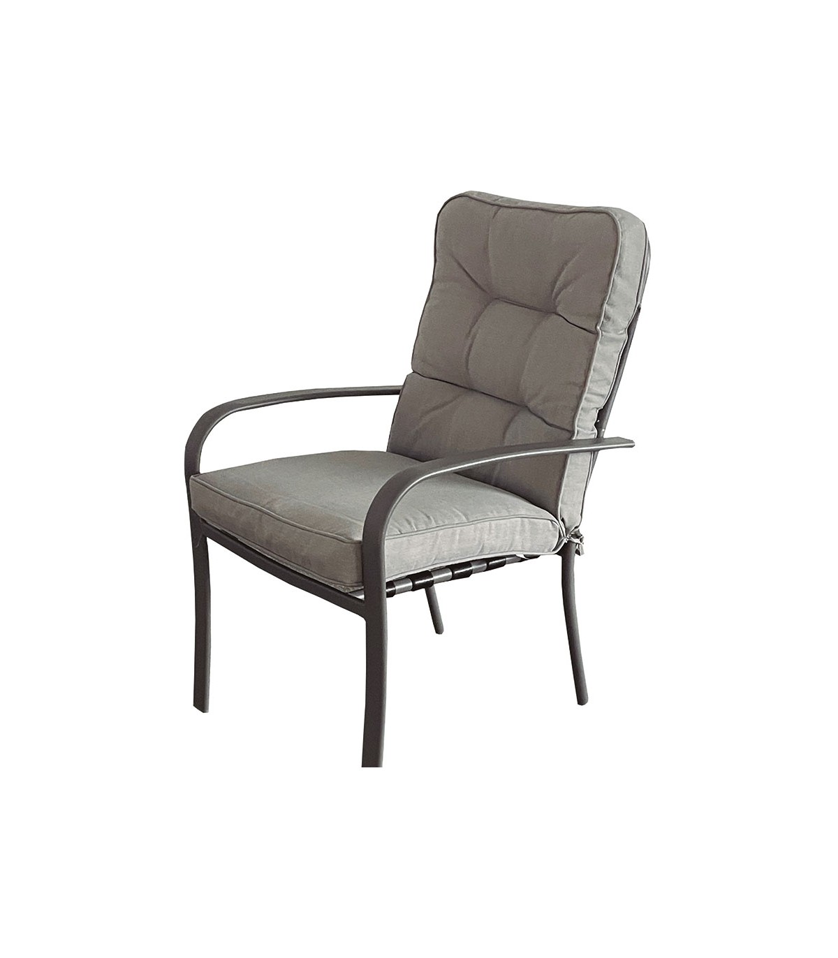 Estructura de acero color gris antracita. Mesa con superficie de cristal templado. Sillones con cojines de poliester.